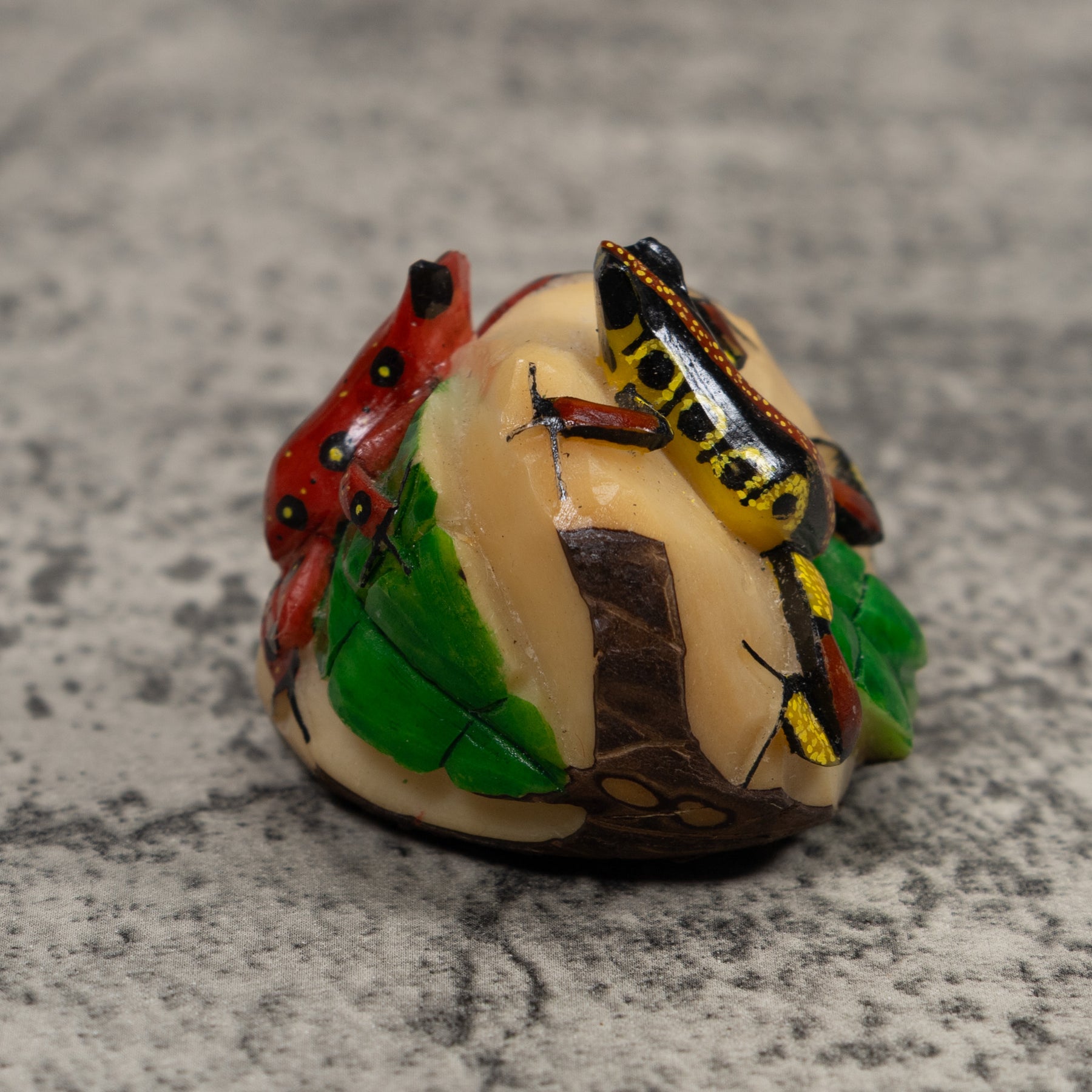 Hand carved from sustainably harvested tagua nut, often called “vegetable ivory”, this charming Double Frog celebrates the rich biodiversity of the Latin American rainforest. Each small sculpture is created by skilled artisans in Panama who carefully shape and polish the natural nut before bringing the animal to life with detailed hand painting. Every piece is made by our artisan partners for TraderBrock, helping support traditional craft and fair, long term relationships with local makers.