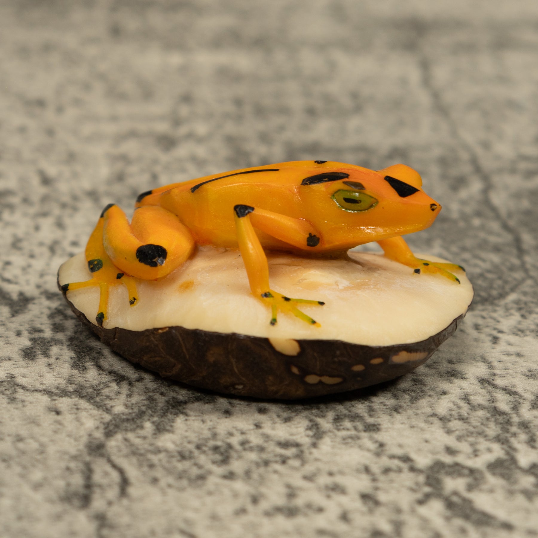 Hand carved from sustainably harvested tagua nut, often called “vegetable ivory”, this charming Golden Frog Tagua Carving celebrates the rich biodiversity of the Latin American rainforest. Each small sculpture is created by skilled artisans in Panama who carefully shape and polish the natural nut before bringing the animal to life with detailed hand painting. Every piece is made by our artisan partners for TraderBrock, helping support traditional craft and fair, long term relationships with local makers.