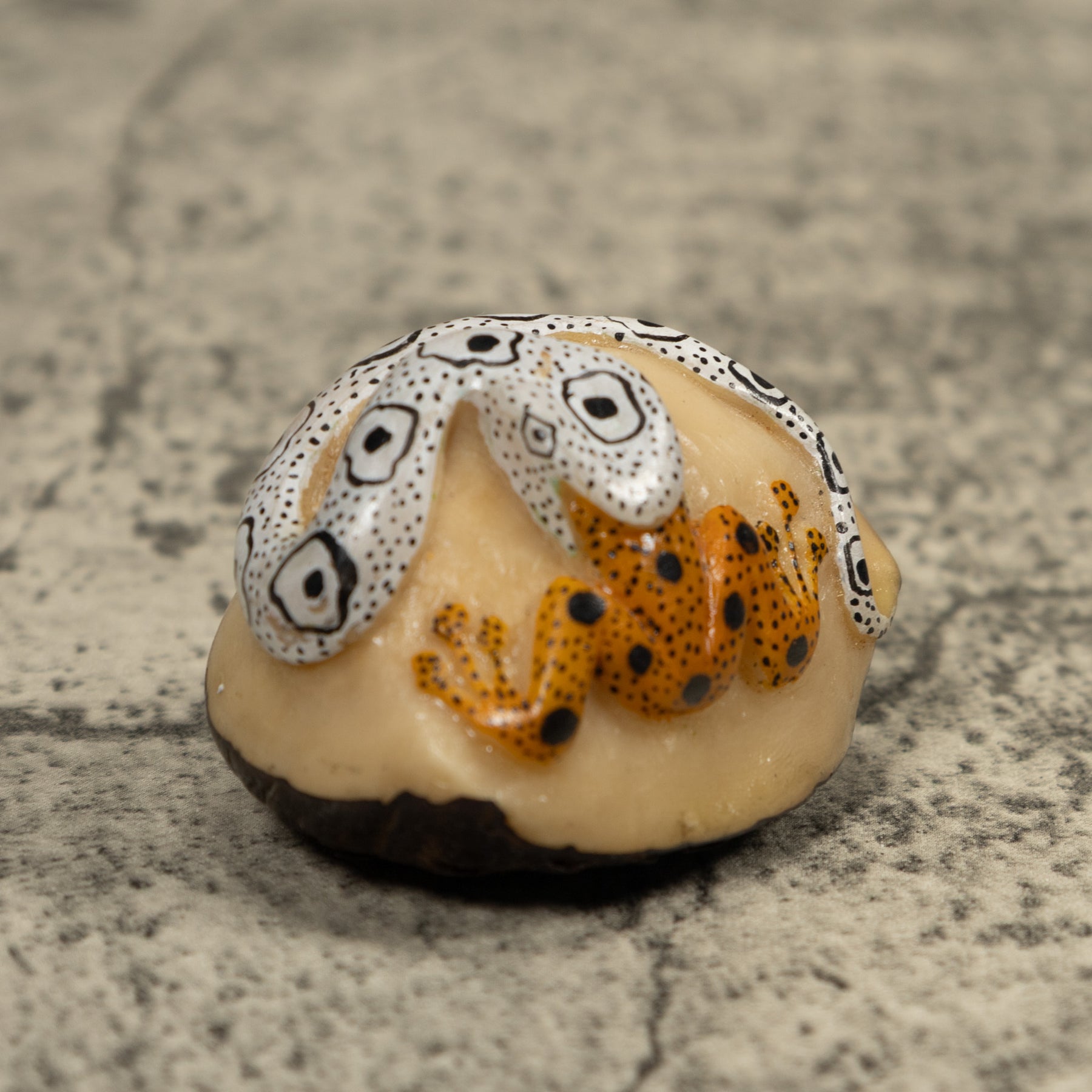 Hand carved from sustainably harvested tagua nut, often called “vegetable ivory”, this charming Snake Eating A Frog  celebrates the rich biodiversity of the Latin American rainforest. Each small sculpture is created by skilled artisans in Panama who carefully shape and polish the natural nut before bringing the animal to life with detailed hand painting. Every piece is made by our artisan partners for TraderBrock, helping support traditional craft and fair, long term relationships with local makers.