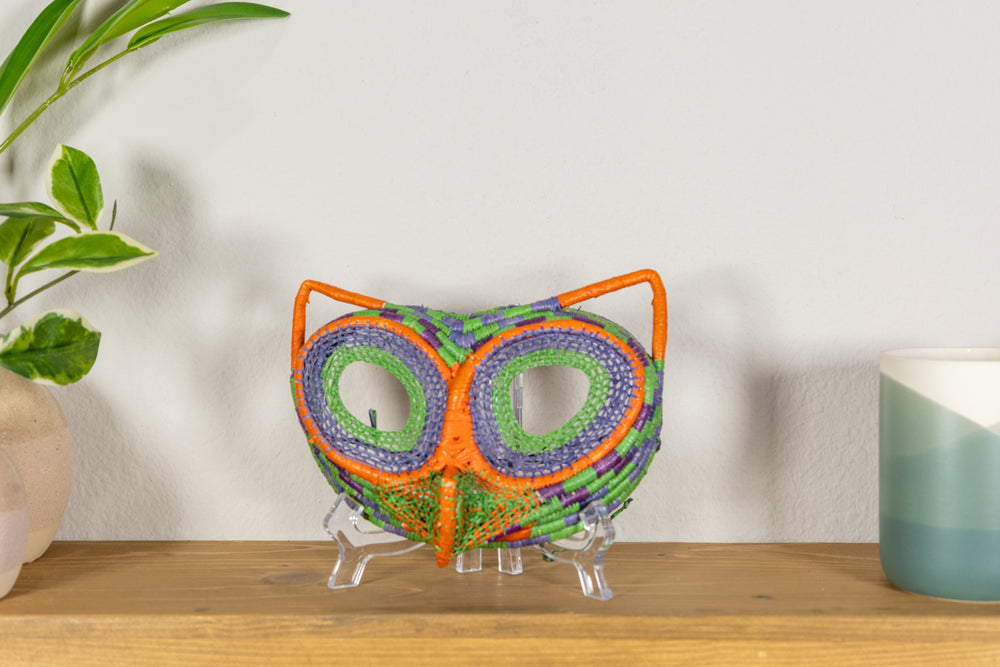 This intricately handwoven Purple Shock Owl Mask is the perfect addition to any wall. The beautiful colors and patterns are eye-catching and will liven up any room. Not to mention, it's a great conversation starter! The mask is also Fair Trade, so you can feel good about your purchase knowing that you are directly contributing to the Indigenous artisan community of Panama.