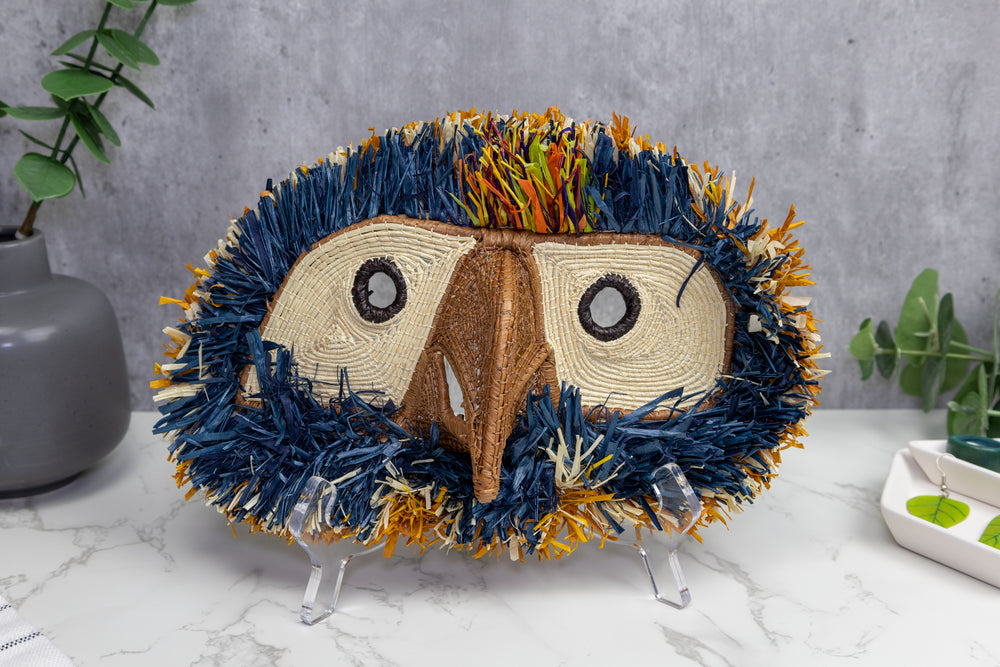 Watch over your home with this handmade woven owl wall mask. This tribal mask is hand-woven with Fair Trade practices from Panama. It's the perfect addition to any jungle decor or anyone who loves exotic animals. This decorative mask also makes for a great conversation starter and makes a wonderful handmade gift