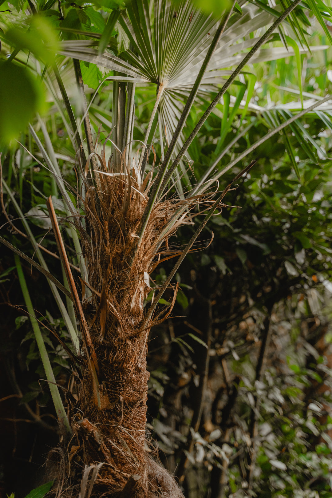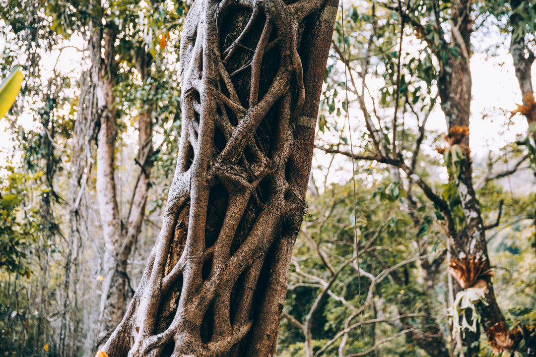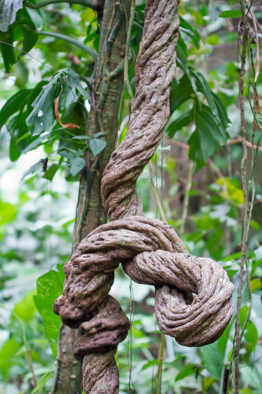 A close-up of a trumpet vine, used for basket making. The strong and flexible vine is harvested and processed to make durable baskets for various uses