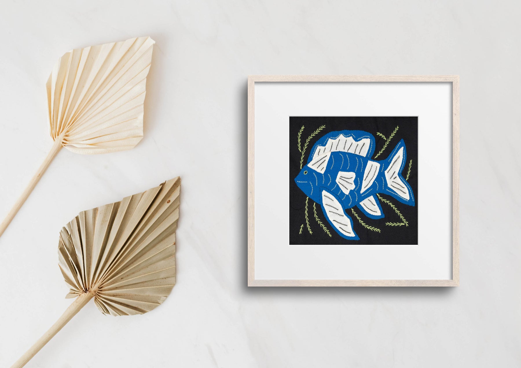 Hand sewn from layered cotton fabric, this colorful Blue And White Fantasy Fish Molita celebrates the traditional textile art of the Guna people of Panama. Each small panel is created using reverse appliqué, where artisans carefully cut and stitch several layers of cloth to reveal intricate patterns, animals, and geometric motifs. Every molita is made by our artisan partners for TraderBrock, supporting long term relationships with Guna communities in the Guna Yala region.