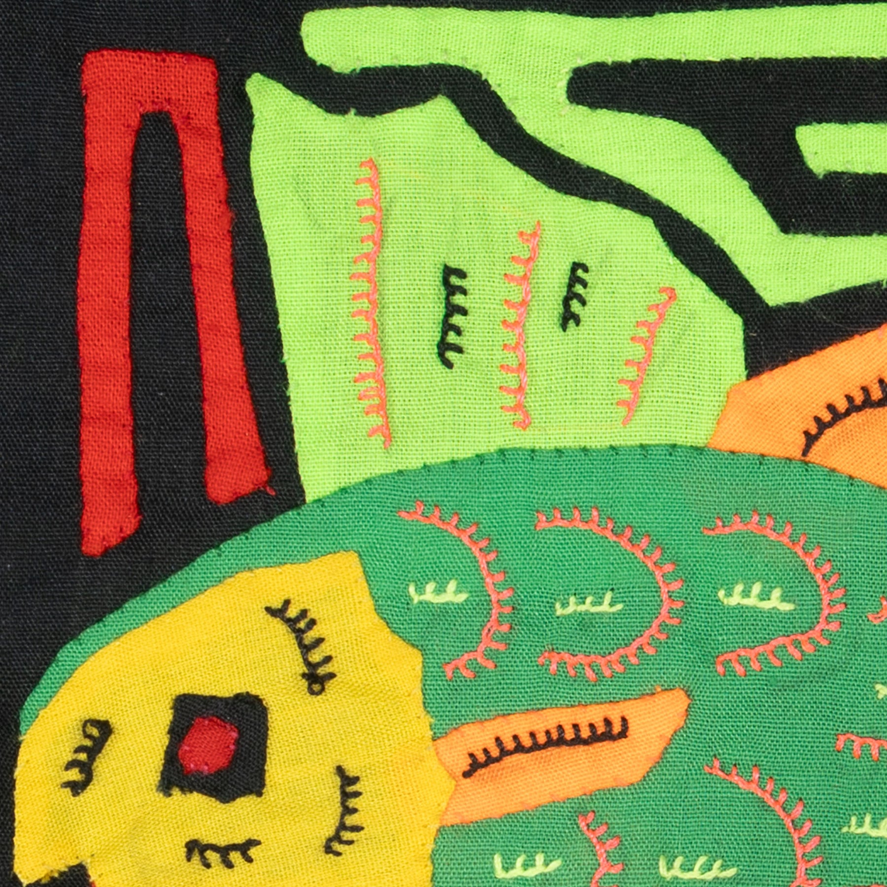 Hand sewn from layered cotton fabric, this colorful Green And Orange Fantasy Fish Molita celebrates the traditional textile art of the Guna people of Panama. Each small panel is created using reverse appliqué, where artisans carefully cut and stitch several layers of cloth to reveal intricate patterns, animals, and geometric motifs. Every molita is made by our artisan partners for TraderBrock, supporting long term relationships with Guna communities in the Guna Yala region.