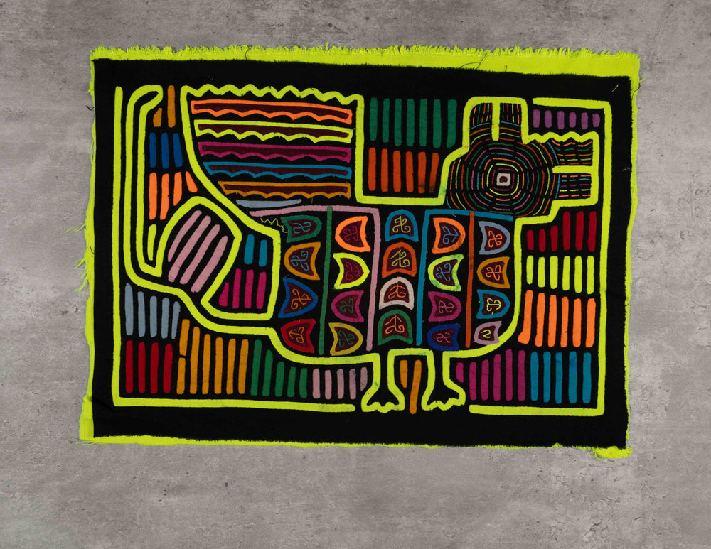 TRADITIONAL CONSTRUCTION & DESIGN: Molas are hand-made using a reverse appliqué technique using several layers of different colored cloth. The largest pattern is typically cut from the top layer and smaller patterns from each underlying layer. Geometric molas are the most traditional. Originating from ancient body paintings. Designs usually portray wildlife in the Rainforest. Inspiration comes from the nature and beauty that surrounds them.