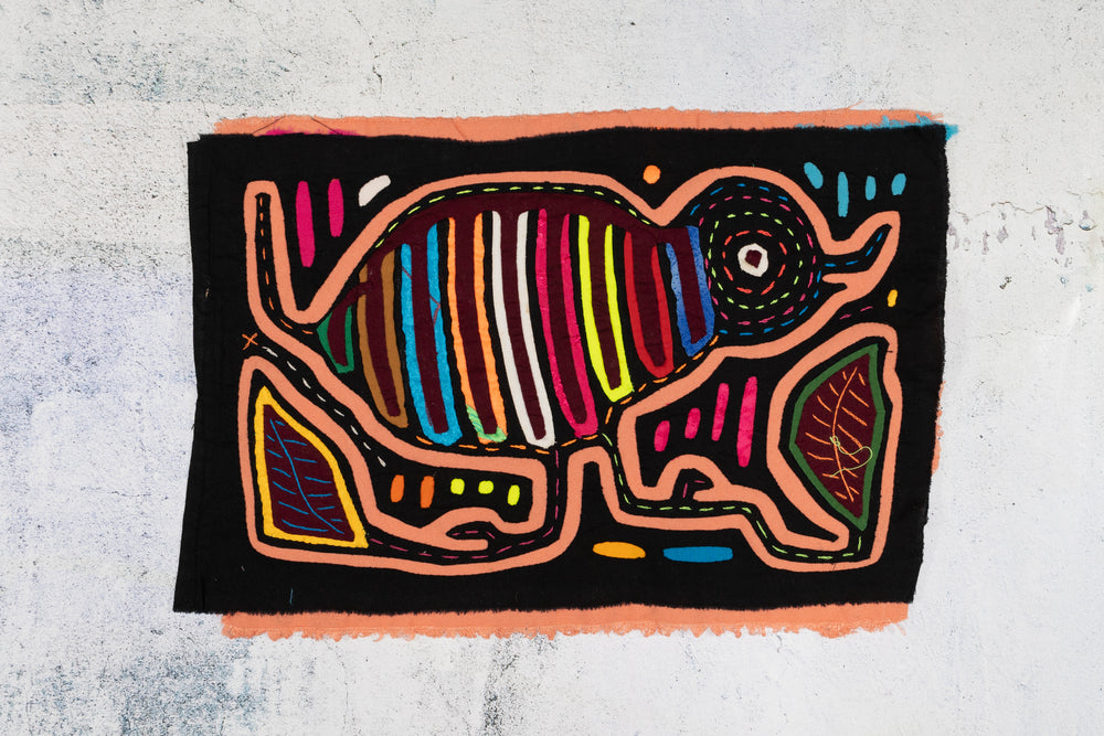 TRADITIONAL CONSTRUCTION & DESIGN: Molas are hand-made using a reverse appliqué technique using several layers of different colored cloth. The largest pattern is typically cut from the top layer and smaller patterns from each underlying layer. Geometric molas are the most traditional. Originating from ancient body paintings. Designs usually portray wildlife in the Rainforest. Inspiration comes from the nature and beauty that surrounds them.