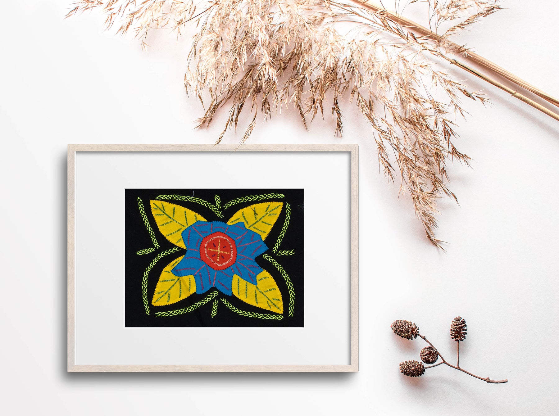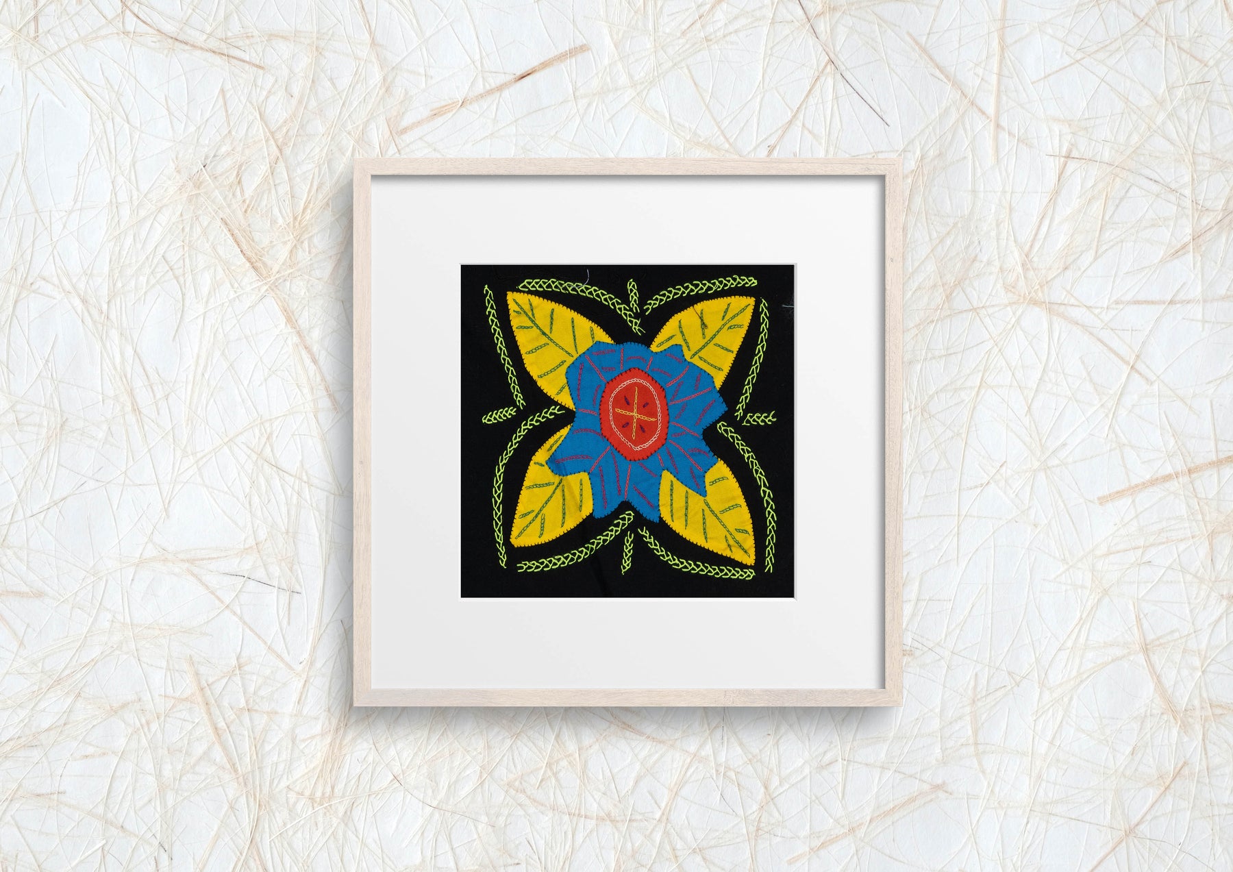 Hand sewn from layered cotton fabric, this colorful Multi-Color Floral Flower Blue And Yellow  Flower  Molita celebrates the traditional textile art of the Guna people of Panama. Each small panel is created using reverse appliqué, where artisans carefully cut and stitch several layers of cloth to reveal intricate patterns, animals, and geometric motifs. Every molita is made by our artisan partners for TraderBrock, supporting long term relationships with Guna communities in the Guna Yala region.