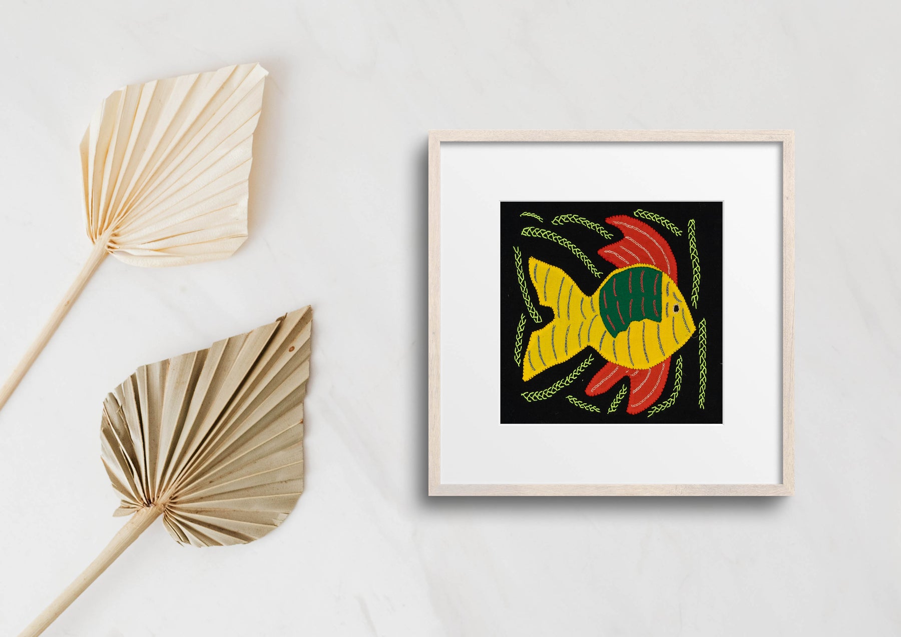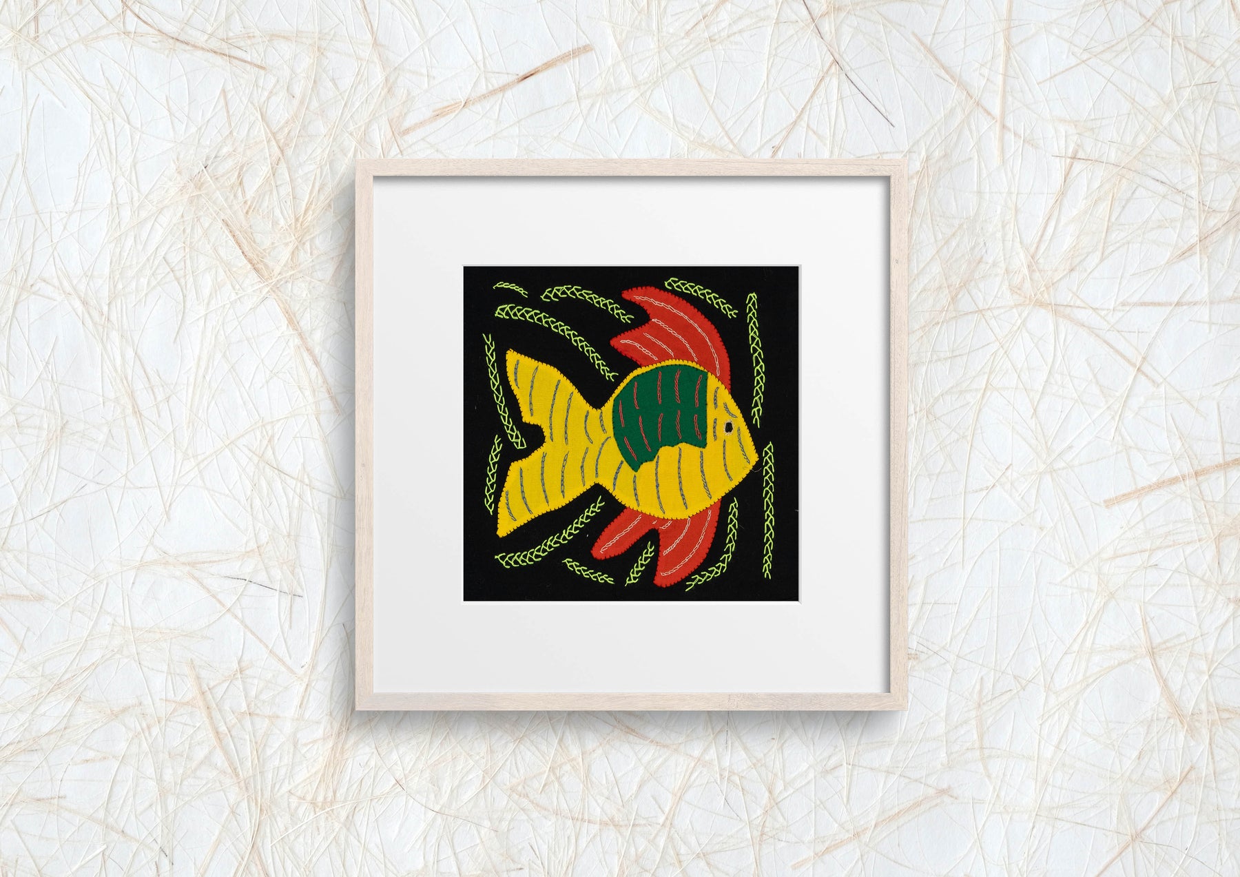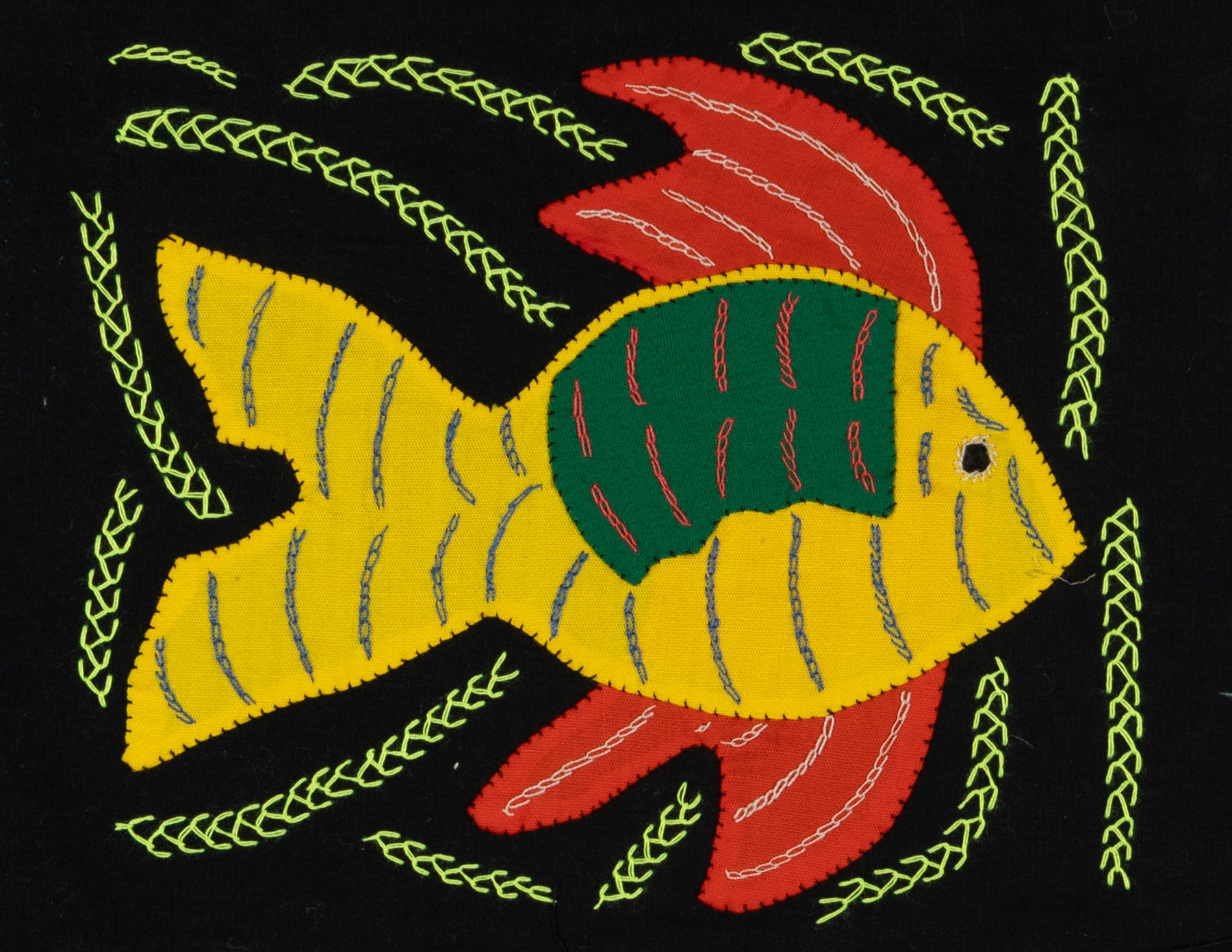 Hand sewn from layered cotton fabric, this colorful Multi-Color Ocean Fantasy Yellow And Red Fish Molita celebrates the traditional textile art of the Guna people of Panama. Each small panel is created using reverse appliqué, where artisans carefully cut and stitch several layers of cloth to reveal intricate patterns, animals, and geometric motifs. Every molita is made by our artisan partners for TraderBrock, supporting long term relationships with Guna communities in the Guna Yala region.