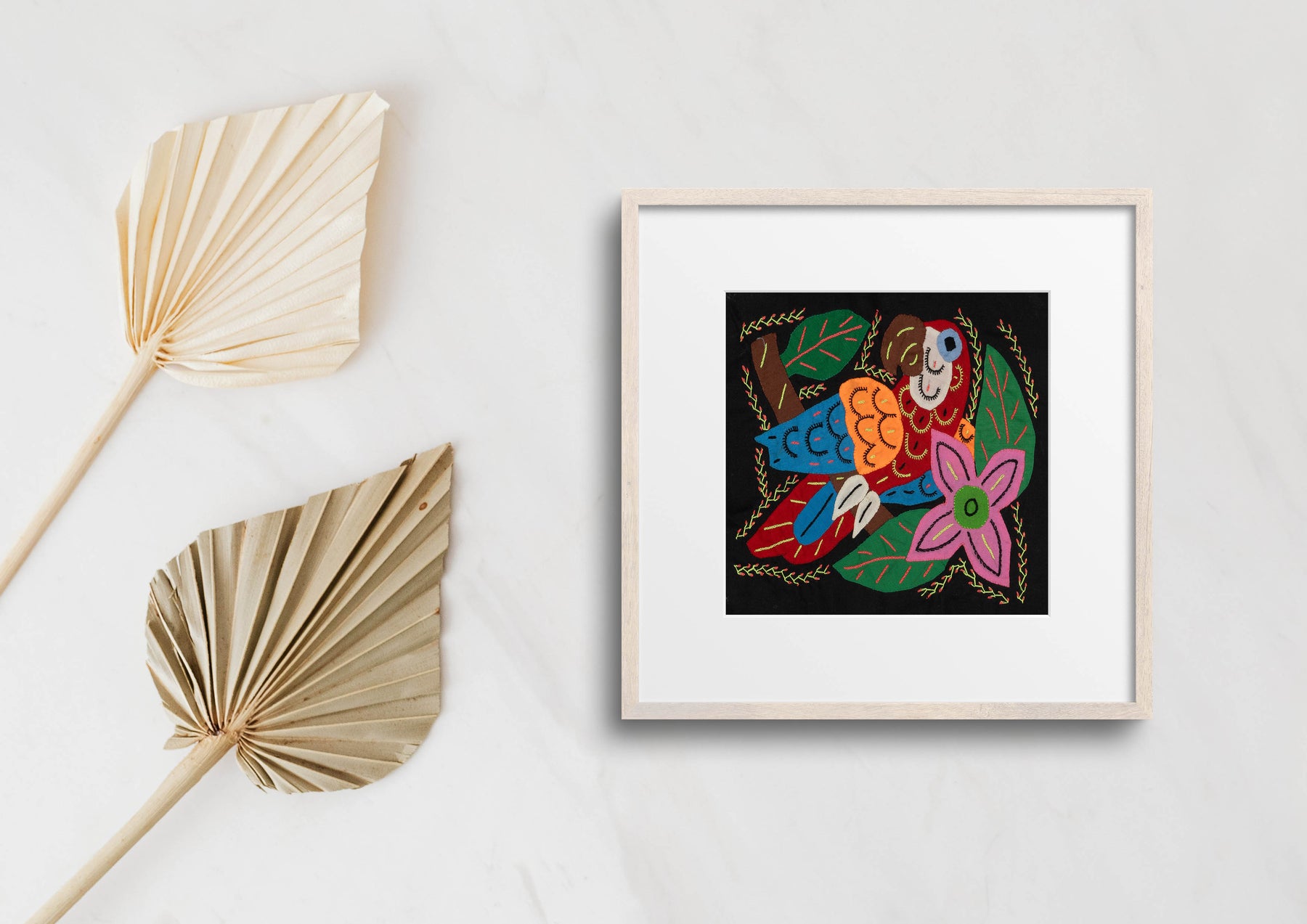 Hand sewn from layered cotton fabric, this colorful Multi-Color Parrot Blue And Red Bird  Molita celebrates the traditional textile art of the Guna people of Panama. Each small panel is created using reverse appliqué, where artisans carefully cut and stitch several layers of cloth to reveal intricate patterns, animals, and geometric motifs. Every molita is made by our artisan partners for TraderBrock, supporting long term relationships with Guna communities in the Guna Yala region.