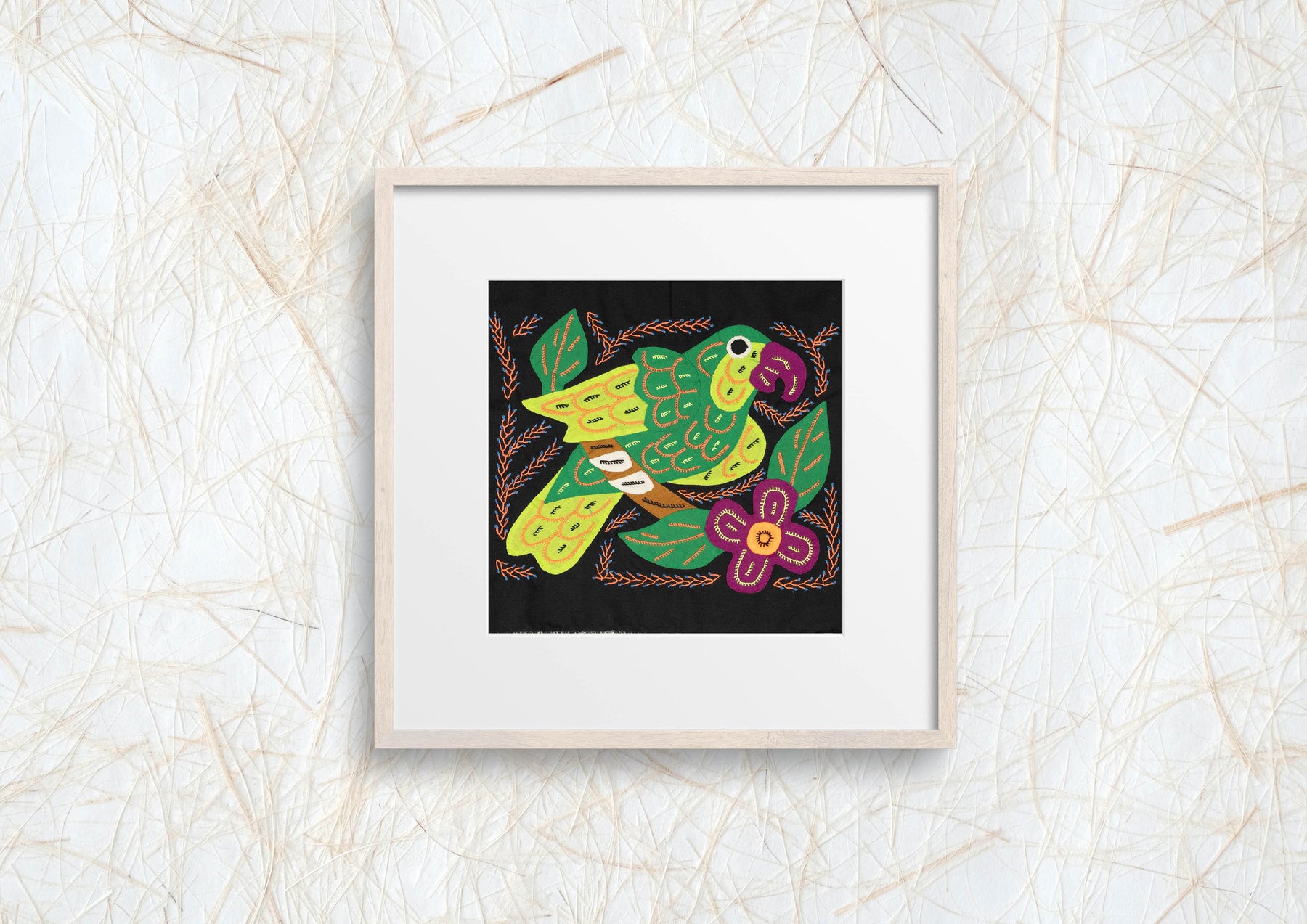 Hand sewn from layered cotton fabric, this colorful Multi-Color Green And Orange Bird Molita celebrates the traditional textile art of the Guna people of Panama. Each small panel is created using reverse appliqué, where artisans carefully cut and stitch several layers of cloth to reveal intricate patterns, animals, and geometric motifs. Every molita is made by our artisan partners for TraderBrock, supporting long term relationships with Guna communities in the Guna Yala region.