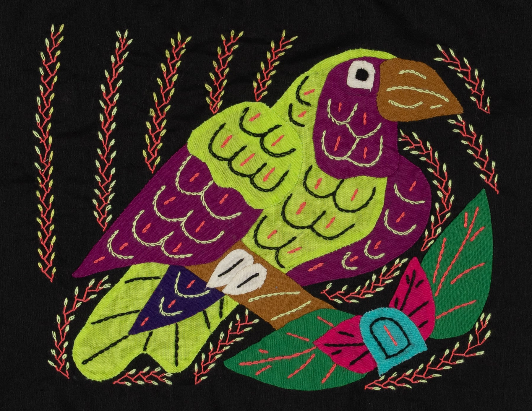 Hand sewn from layered cotton fabric, this colorful Multi-Color Green And Purple Parrot Bird  Molita celebrates the traditional textile art of the Guna people of Panama. Each small panel is created using reverse appliqué, where artisans carefully cut and stitch several layers of cloth to reveal intricate patterns, animals, and geometric motifs. Every molita is made by our artisan partners for TraderBrock, supporting long term relationships with Guna communities in the Guna Yala region.