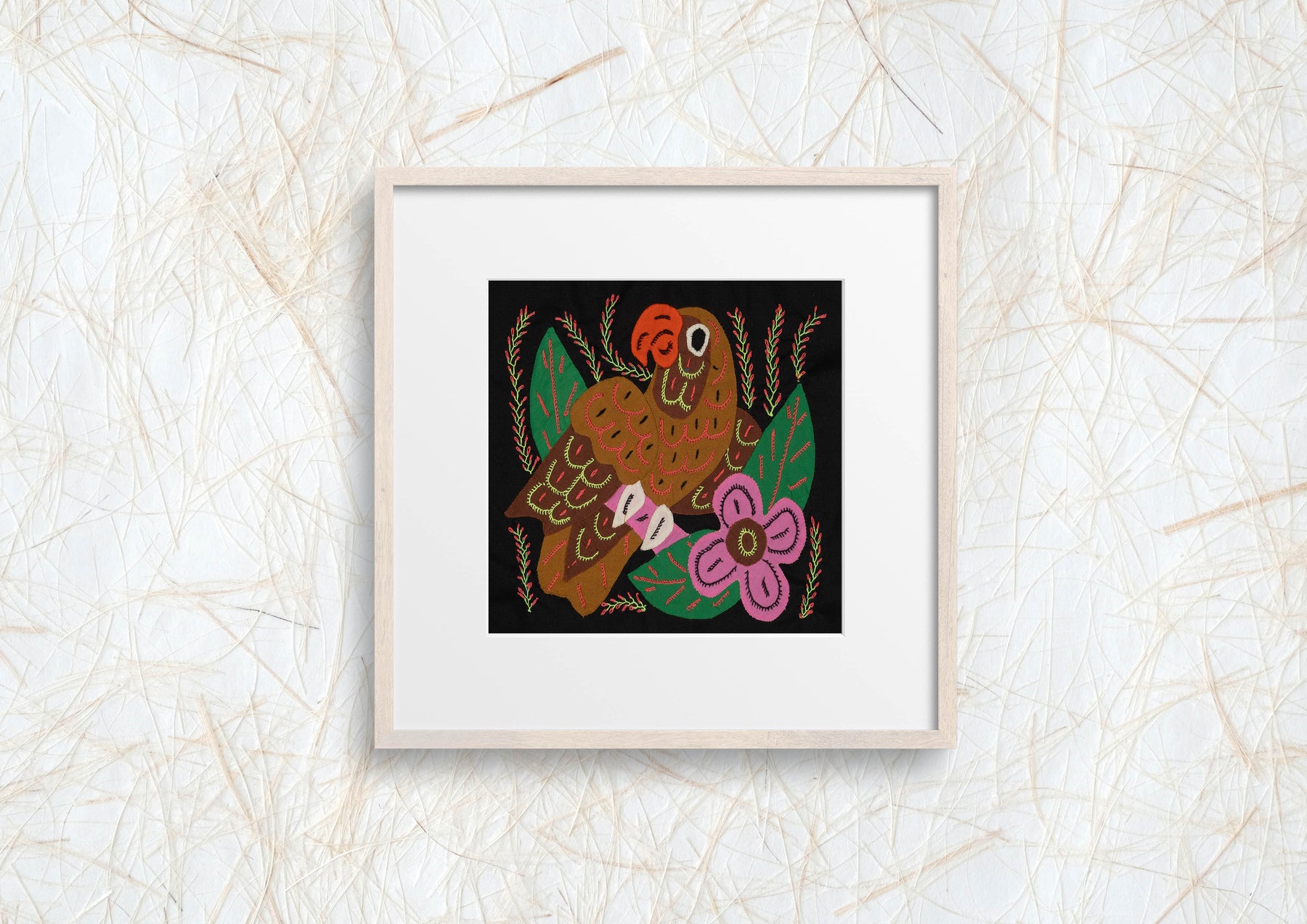 Hand sewn from layered cotton fabric, this colorful Multi-Color Parrot Brown And Pink Bird  Molita celebrates the traditional textile art of the Guna people of Panama. Each small panel is created using reverse appliqué, where artisans carefully cut and stitch several layers of cloth to reveal intricate patterns, animals, and geometric motifs. Every molita is made by our artisan partners for TraderBrock, supporting long term relationships with Guna communities in the Guna Yala region.