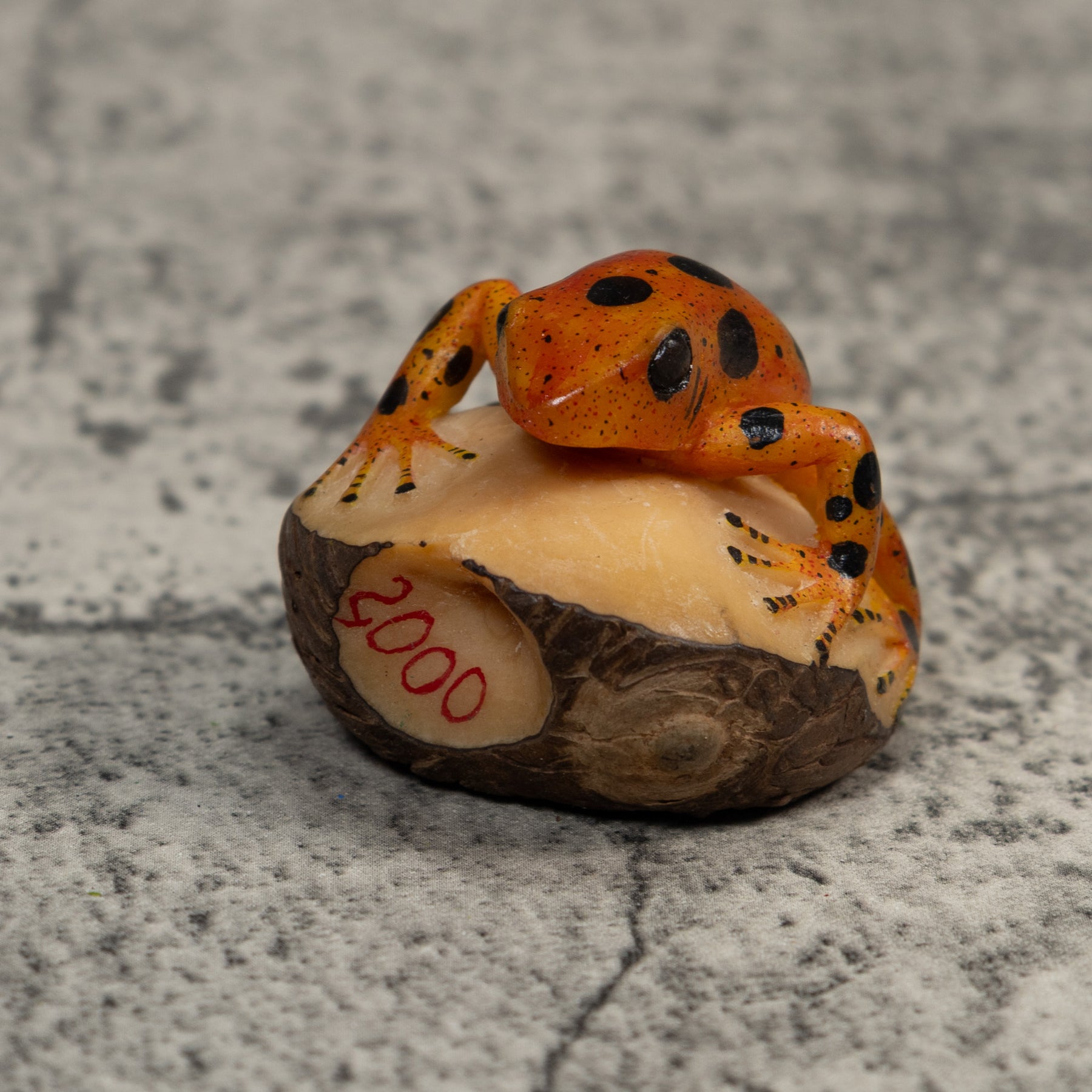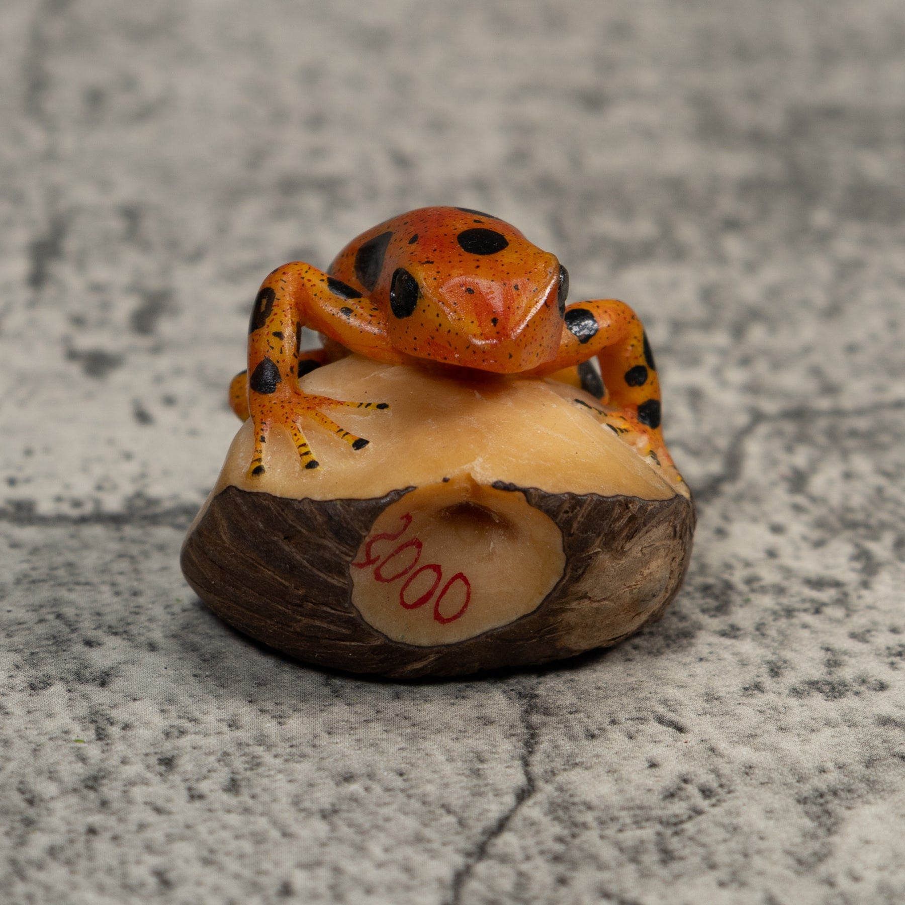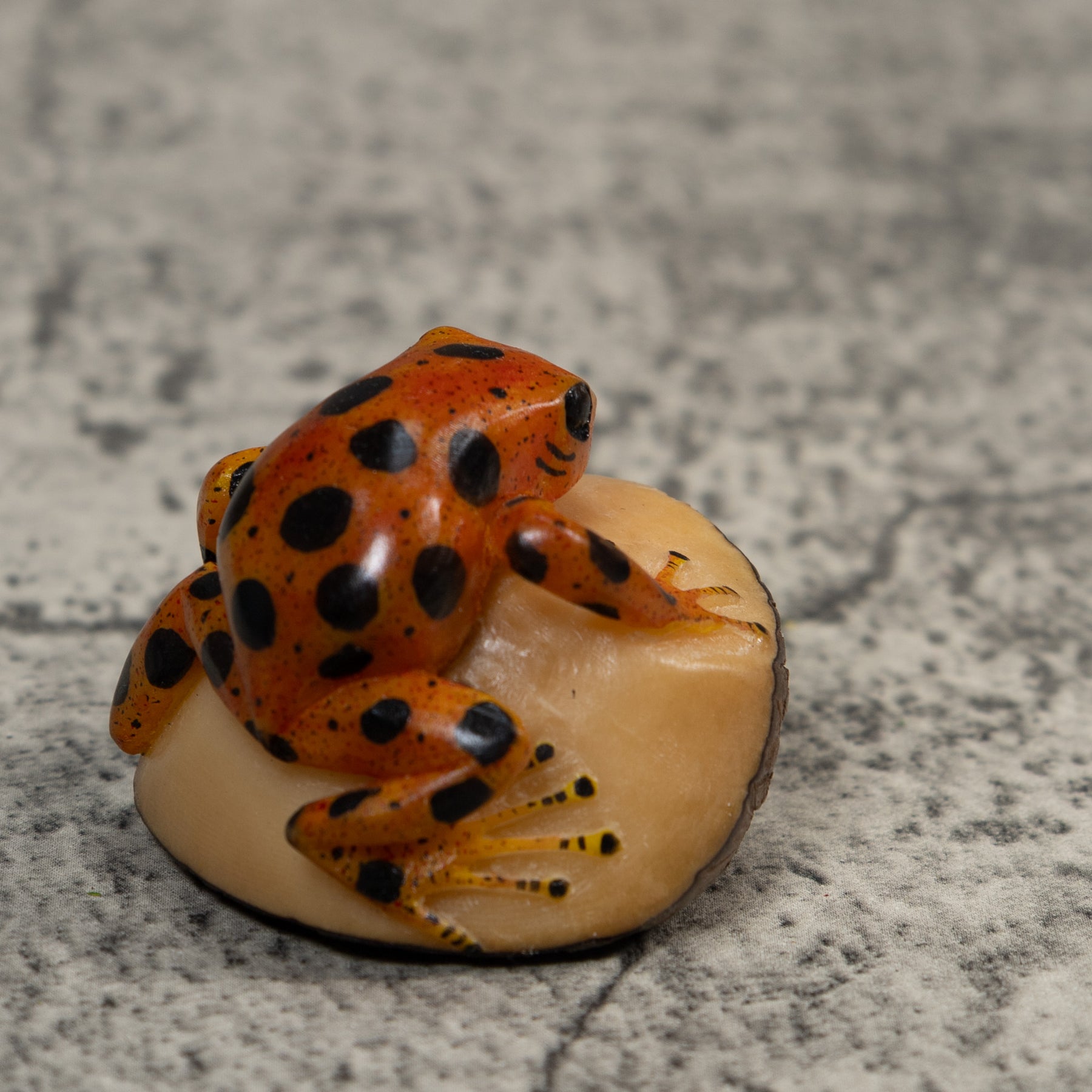 Hand carved from sustainably harvested tagua nut, often called “vegetable ivory”, this charming Frog celebrates the rich biodiversity of the Latin American rainforest. Each small sculpture is created by skilled artisans in Panama who carefully shape and polish the natural nut before bringing the animal to life with detailed hand painting. Every piece is made by our artisan partners for TraderBrock, helping support traditional craft and fair, long term relationships with local makers.