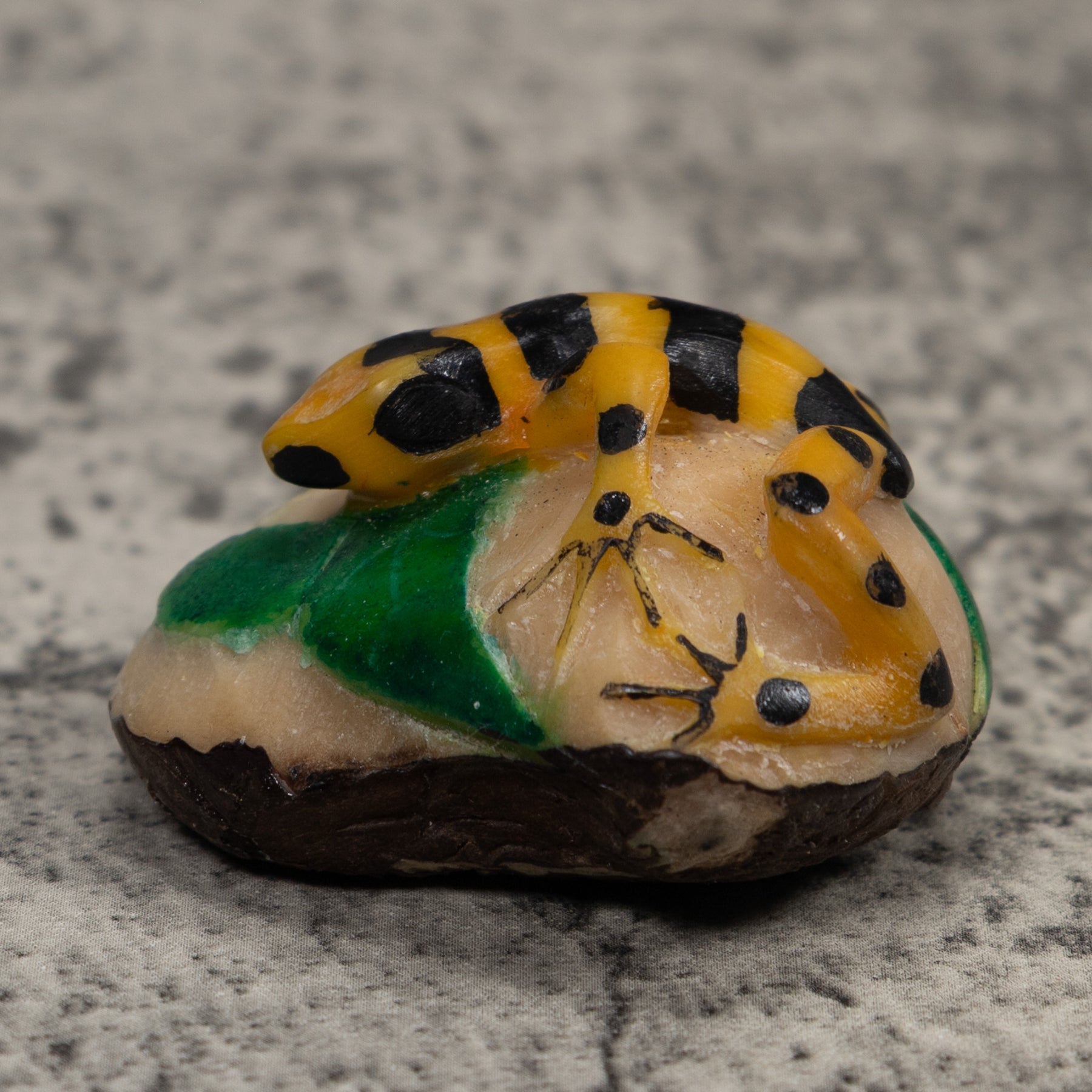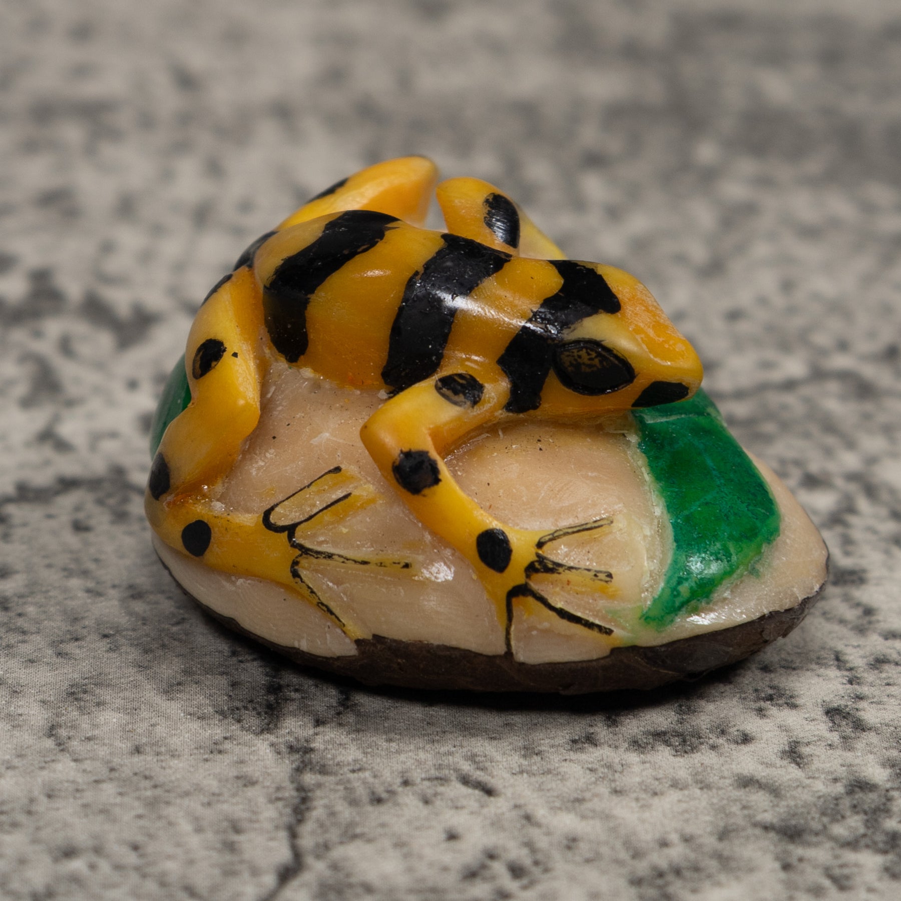 Hand carved from sustainably harvested tagua nut, often called “vegetable ivory”, this charming Golden Frog celebrates the rich biodiversity of the Latin American rainforest. Each small sculpture is created by skilled artisans in Panama who carefully shape and polish the natural nut before bringing the animal to life with detailed hand painting. Every piece is made by our artisan partners for TraderBrock, helping support traditional craft and fair, long term relationships with local makers.