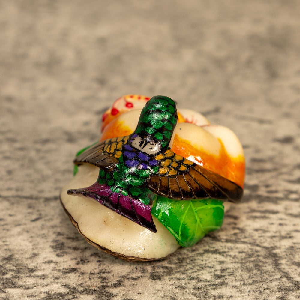 Delve into the world of sustainable art with our exquisite hand-carved Hummingbird tagua nut sculptures. Known as "vegetable ivory," tagua nuts offer a cruelty-free alternative to ivory, making each piece not only beautiful but also eco-friendly. Our skilled artisans dedicate hours to carefully shaping, detailing, and polishing the tagua to highlight its natural luster and intricate textures.
