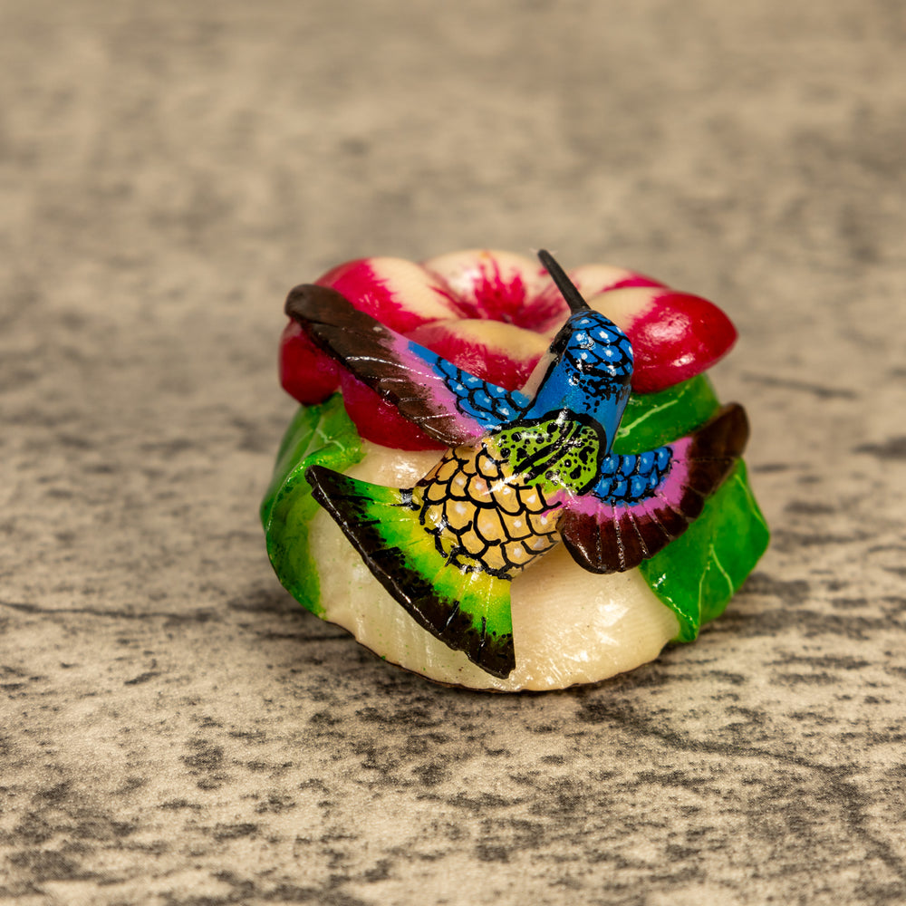 Delve into the world of sustainable art with our exquisite hand-carved Hummingbird tagua nut sculptures. Known as "vegetable ivory," tagua nuts offer a cruelty-free alternative to ivory, making each piece not only beautiful but also eco-friendly. Our skilled artisans dedicate hours to carefully shaping, detailing, and polishing the tagua to highlight its natural luster and intricate textures.