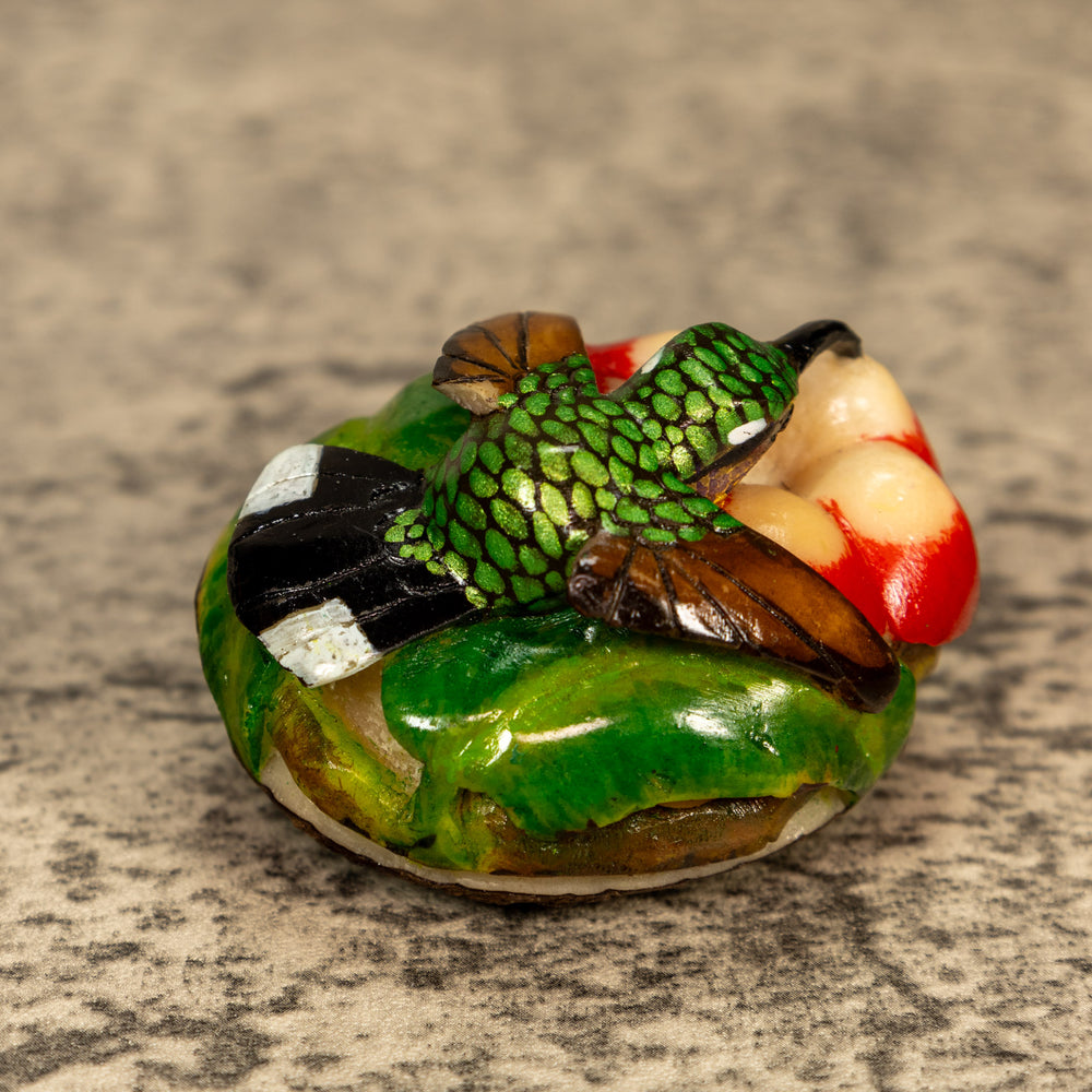 Delve into the world of sustainable art with our exquisite hand-carved Hummingbird tagua nut sculptures. Known as "vegetable ivory," tagua nuts offer a cruelty-free alternative to ivory, making each piece not only beautiful but also eco-friendly. Our skilled artisans dedicate hours to carefully shaping, detailing, and polishing the tagua to highlight its natural luster and intricate textures.
