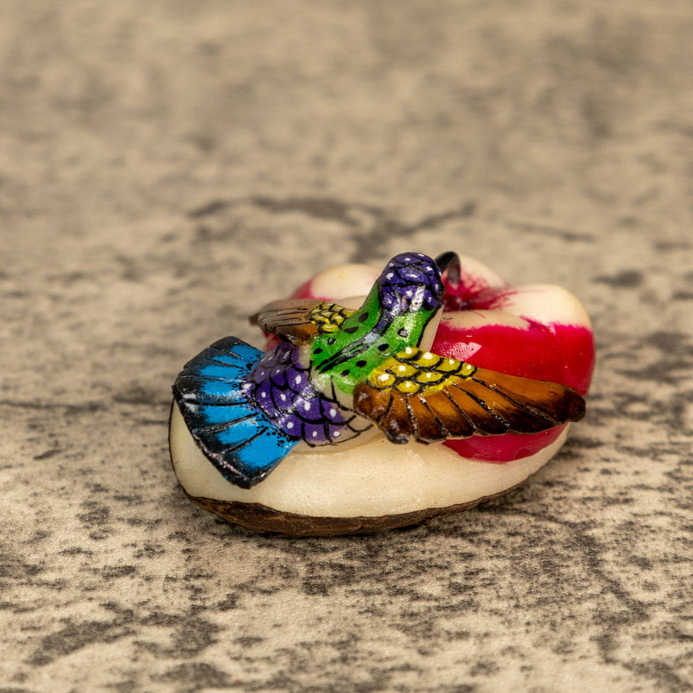 Delve into the world of sustainable art with our exquisite hand-carved Hummingbird tagua nut sculptures. Known as "vegetable ivory," tagua nuts offer a cruelty-free alternative to ivory, making each piece not only beautiful but also eco-friendly. Our skilled artisans dedicate hours to carefully shaping, detailing, and polishing the tagua to highlight its natural luster and intricate textures.