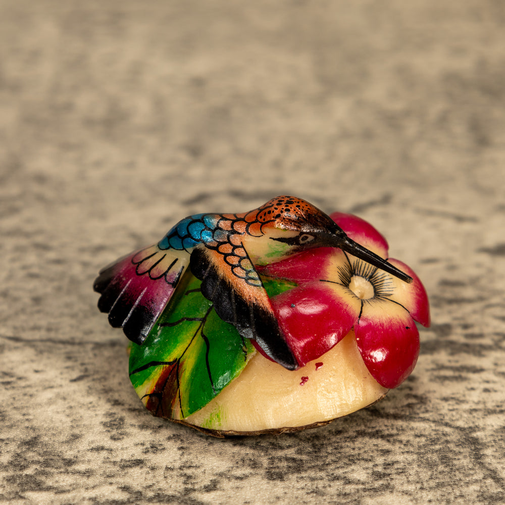 Delve into the world of sustainable art with our exquisite hand-carved Hummingbird tagua nut sculptures. Known as "vegetable ivory," tagua nuts offer a cruelty-free alternative to ivory, making each piece not only beautiful but also eco-friendly. Our skilled artisans dedicate hours to carefully shaping, detailing, and polishing the tagua to highlight its natural luster and intricate textures.