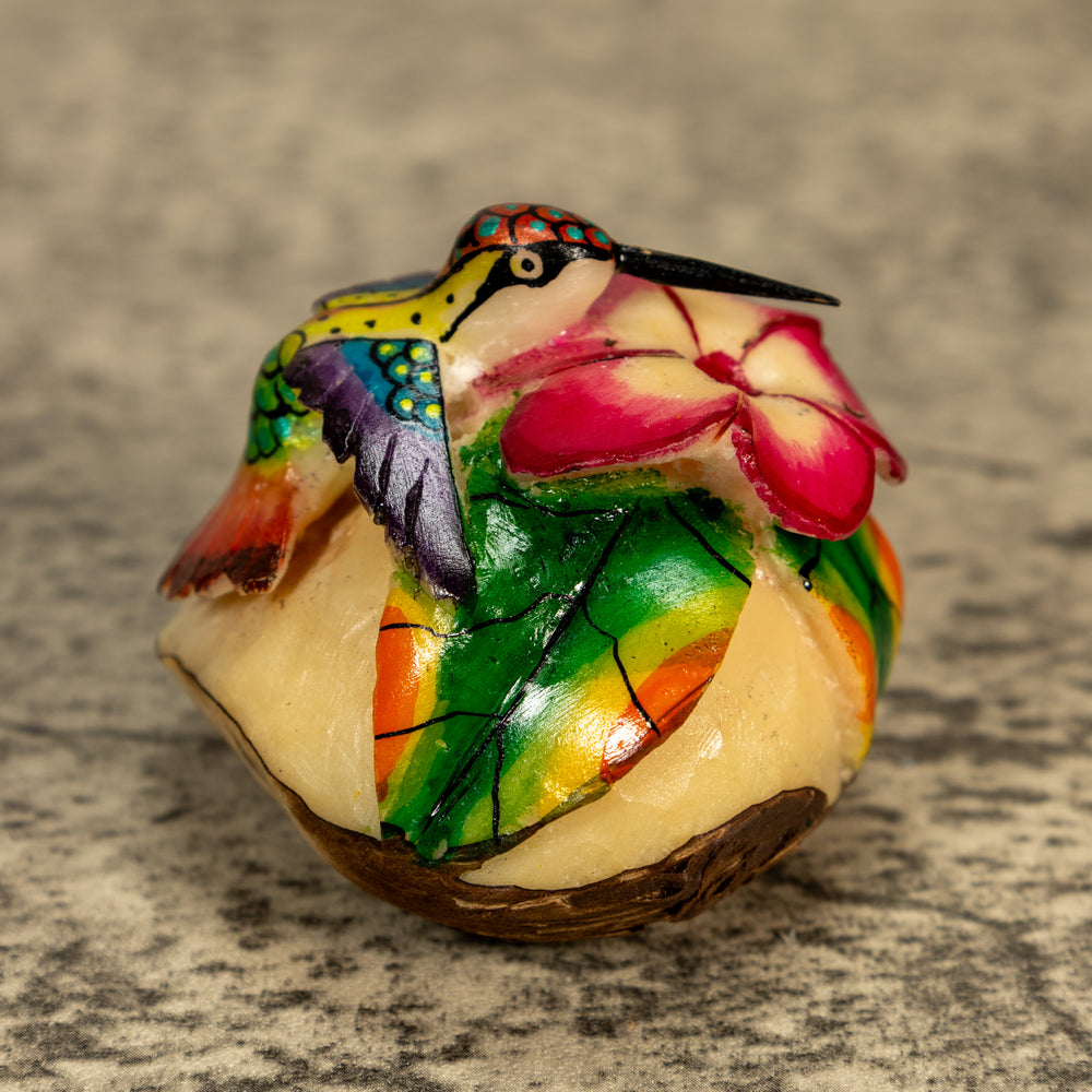 Delve into the world of sustainable art with our exquisite hand-carved Hummingbird tagua nut sculptures. Known as "vegetable ivory," tagua nuts offer a cruelty-free alternative to ivory, making each piece not only beautiful but also eco-friendly. Our skilled artisans dedicate hours to carefully shaping, detailing, and polishing the tagua to highlight its natural luster and intricate textures.
