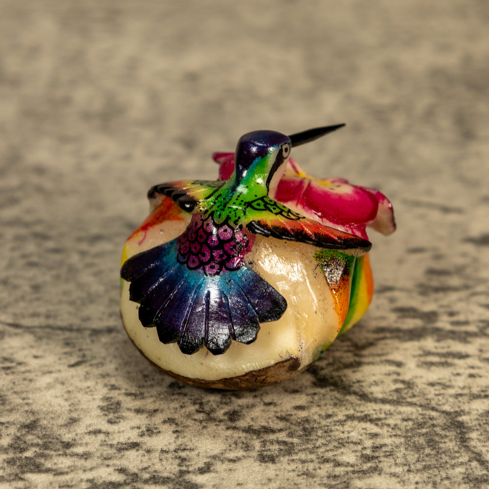 Delve into the world of sustainable art with our exquisite hand-carved Hummingbird tagua nut sculptures. Known as "vegetable ivory," tagua nuts offer a cruelty-free alternative to ivory, making each piece not only beautiful but also eco-friendly. Our skilled artisans dedicate hours to carefully shaping, detailing, and polishing the tagua to highlight its natural luster and intricate textures.