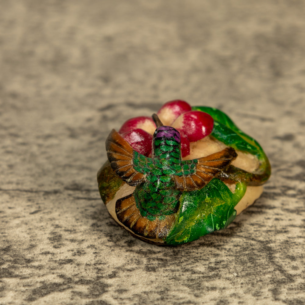 Delve into the world of sustainable art with our exquisite hand-carved Hummingbird tagua nut sculptures. Known as "vegetable ivory," tagua nuts offer a cruelty-free alternative to ivory, making each piece not only beautiful but also eco-friendly. Our skilled artisans dedicate hours to carefully shaping, detailing, and polishing the tagua to highlight its natural luster and intricate textures.