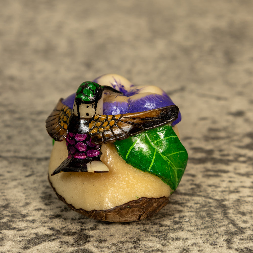 Delve into the world of sustainable art with our exquisite hand-carved Hummingbird tagua nut sculptures. Known as "vegetable ivory," tagua nuts offer a cruelty-free alternative to ivory, making each piece not only beautiful but also eco-friendly. Our skilled artisans dedicate hours to carefully shaping, detailing, and polishing the tagua to highlight its natural luster and intricate textures.