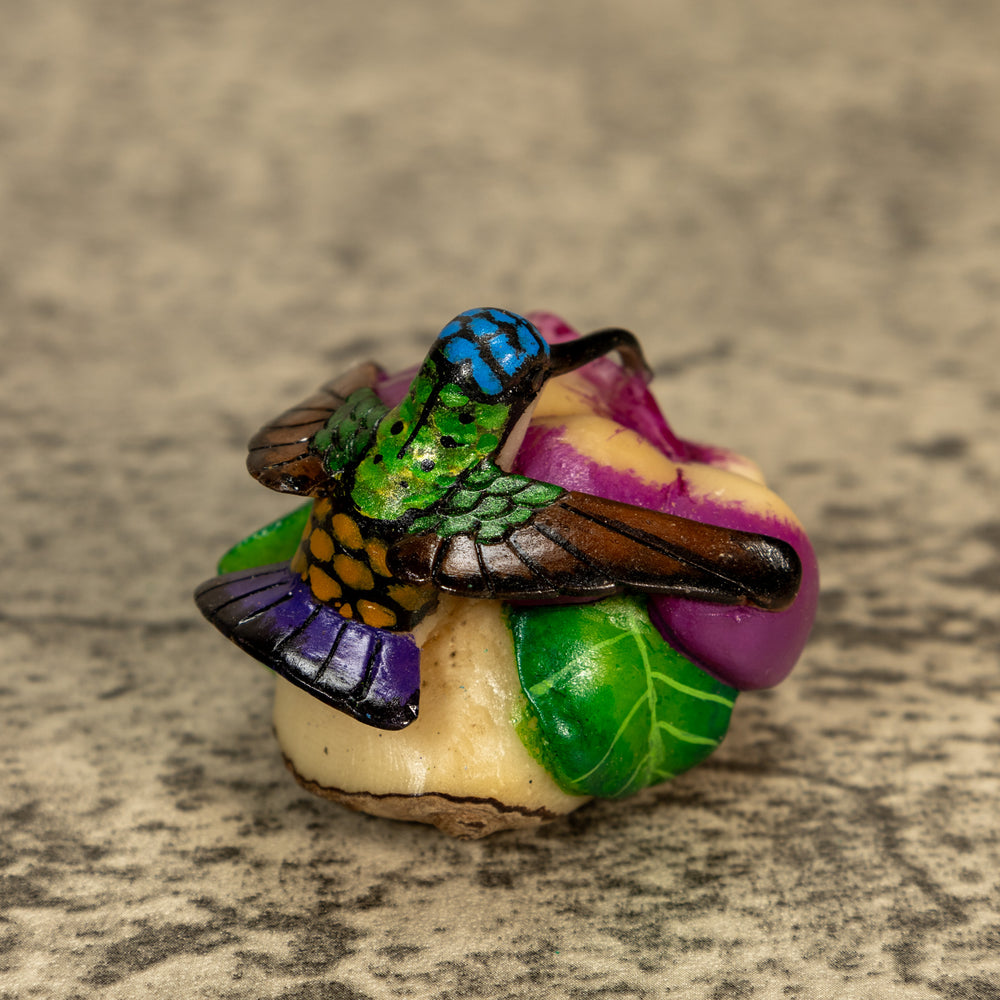 Delve into the world of sustainable art with our exquisite hand-carved Hummingbird tagua nut sculptures. Known as "vegetable ivory," tagua nuts offer a cruelty-free alternative to ivory, making each piece not only beautiful but also eco-friendly. Our skilled artisans dedicate hours to carefully shaping, detailing, and polishing the tagua to highlight its natural luster and intricate textures.
