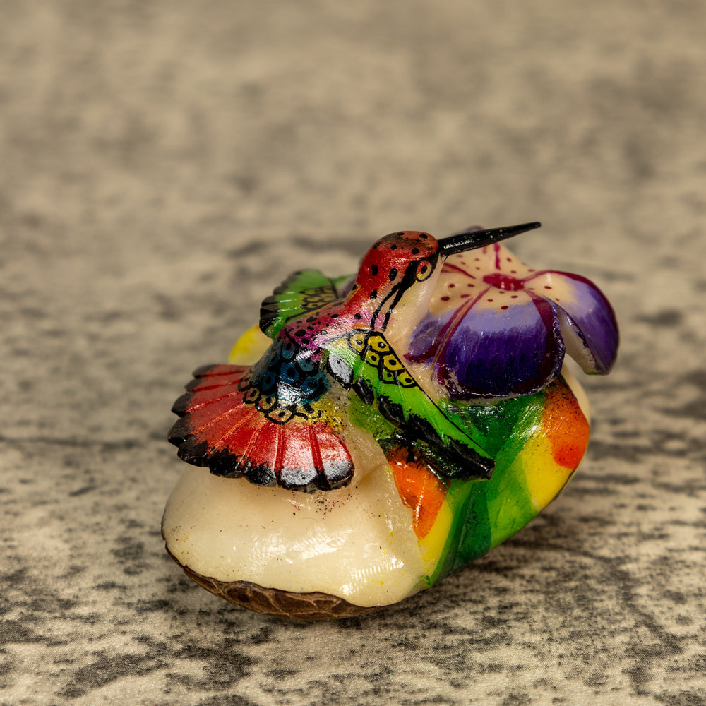Delve into the world of sustainable art with our exquisite hand-carved Hummingbird tagua nut sculptures. Known as "vegetable ivory," tagua nuts offer a cruelty-free alternative to ivory, making each piece not only beautiful but also eco-friendly. Our skilled artisans dedicate hours to carefully shaping, detailing, and polishing the tagua to highlight its natural luster and intricate textures.