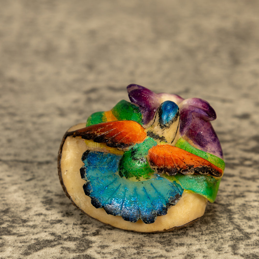 Delve into the world of sustainable art with our exquisite hand-carved Hummingbird tagua nut sculptures. Known as "vegetable ivory," tagua nuts offer a cruelty-free alternative to ivory, making each piece not only beautiful but also eco-friendly. Our skilled artisans dedicate hours to carefully shaping, detailing, and polishing the tagua to highlight its natural luster and intricate textures.