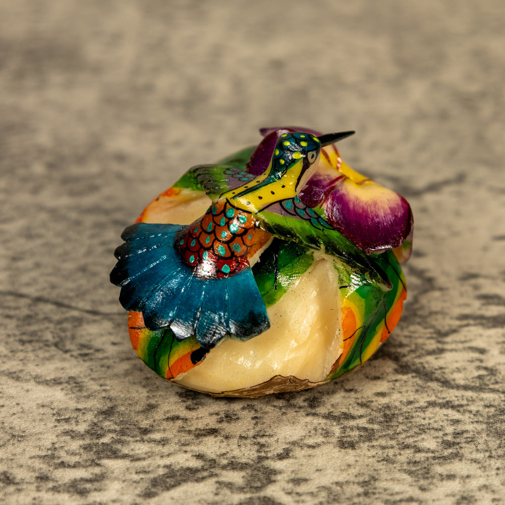 Delve into the world of sustainable art with our exquisite hand-carved Hummingbird tagua nut sculptures. Known as "vegetable ivory," tagua nuts offer a cruelty-free alternative to ivory, making each piece not only beautiful but also eco-friendly. Our skilled artisans dedicate hours to carefully shaping, detailing, and polishing the tagua to highlight its natural luster and intricate textures.