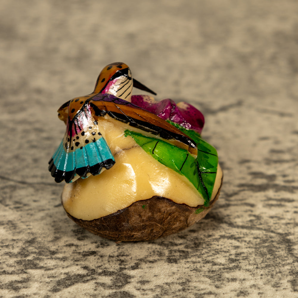 Delve into the world of sustainable art with our exquisite hand-carved Hummingbird tagua nut sculptures. Known as "vegetable ivory," tagua nuts offer a cruelty-free alternative to ivory, making each piece not only beautiful but also eco-friendly. Our skilled artisans dedicate hours to carefully shaping, detailing, and polishing the tagua to highlight its natural luster and intricate textures.