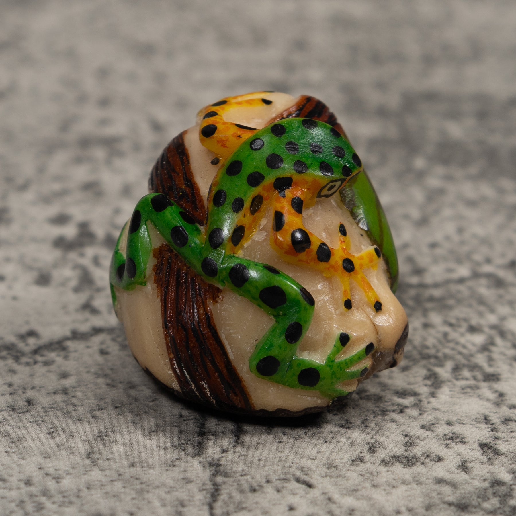 Hand carved from sustainably harvested tagua nut, often called “vegetable ivory”, this charming Frog celebrates the rich biodiversity of the Latin American rainforest. Each small sculpture is created by skilled artisans in Panama who carefully shape and polish the natural nut before bringing the animal to life with detailed hand painting. Every piece is made by our artisan partners for TraderBrock, helping support traditional craft and fair, long term relationships with local makers.