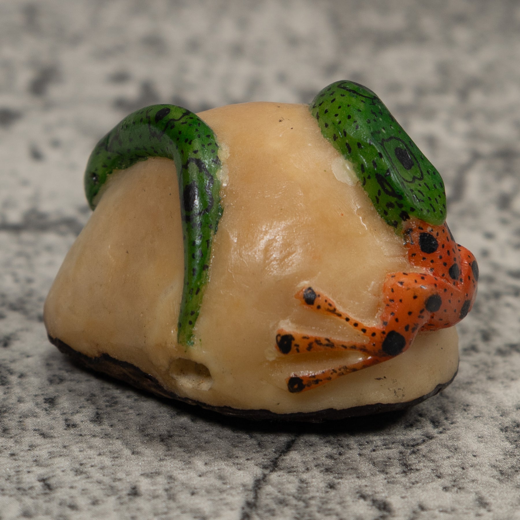 Hand carved from sustainably harvested tagua nut, often called “vegetable ivory”, this charming Frog celebrates the rich biodiversity of the Latin American rainforest. Each small sculpture is created by skilled artisans in Panama who carefully shape and polish the natural nut before bringing the animal to life with detailed hand painting. Every piece is made by our artisan partners for TraderBrock, helping support traditional craft and fair, long term relationships with local makers.