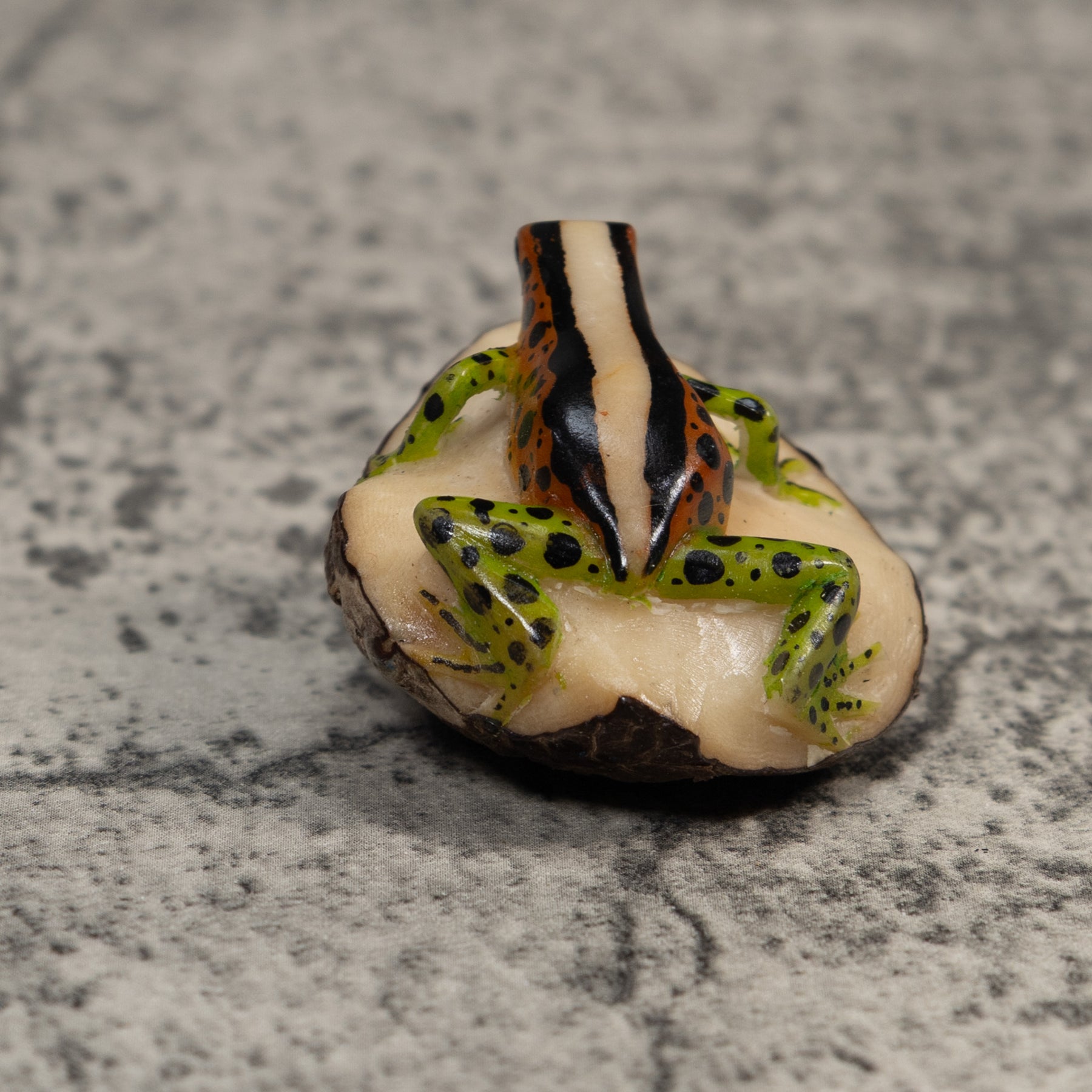 Hand carved from sustainably harvested tagua nut, often called “vegetable ivory”, this charming Frog celebrates the rich biodiversity of the Latin American rainforest. Each small sculpture is created by skilled artisans in Panama who carefully shape and polish the natural nut before bringing the animal to life with detailed hand painting. Every piece is made by our artisan partners for TraderBrock, helping support traditional craft and fair, long term relationships with local makers.