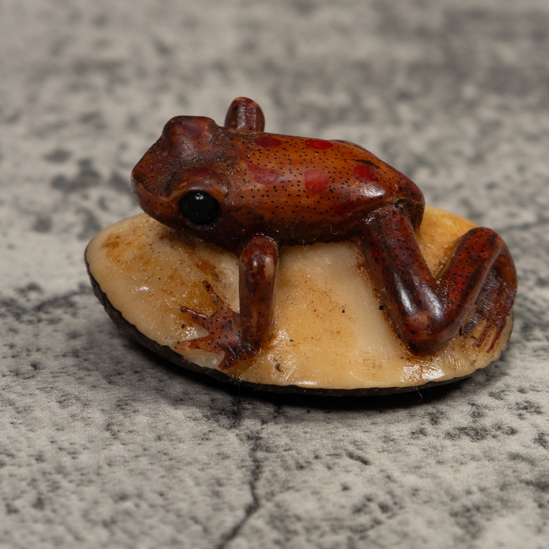 Hand carved from sustainably harvested tagua nut, often called “vegetable ivory”, this charming Frog celebrates the rich biodiversity of the Latin American rainforest. Each small sculpture is created by skilled artisans in Panama who carefully shape and polish the natural nut before bringing the animal to life with detailed hand painting. Every piece is made by our artisan partners for TraderBrock, helping support traditional craft and fair, long term relationships with local makers.
