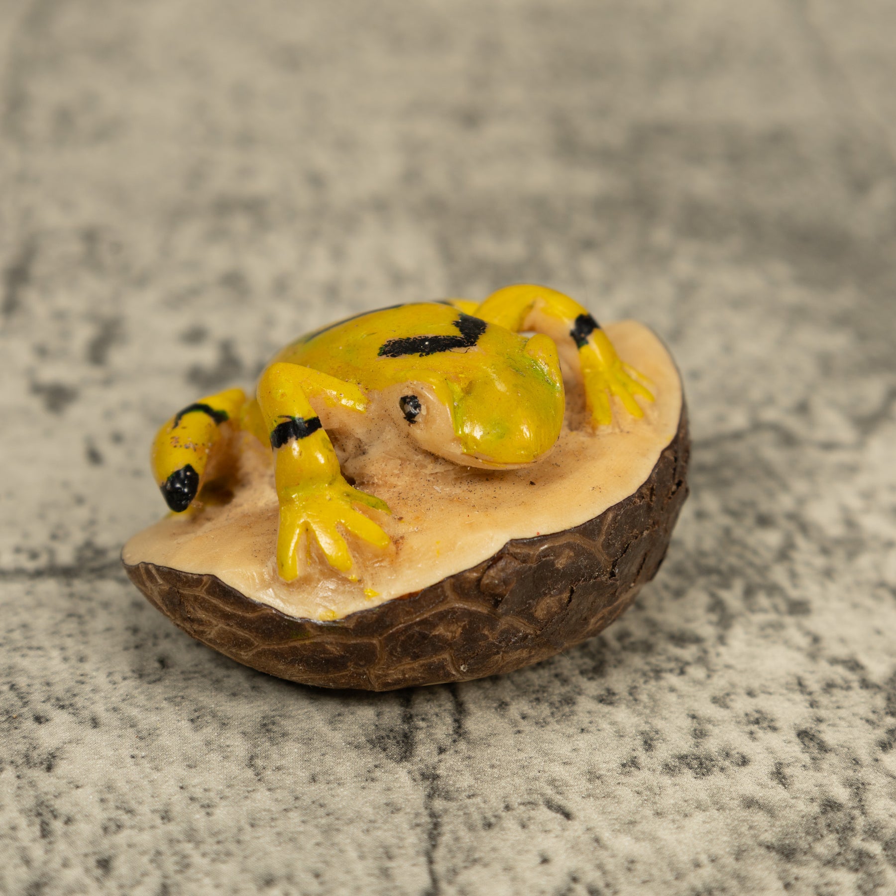 Hand carved from sustainably harvested tagua nut, often called “vegetable ivory”, this charming Golden Frog celebrates the rich biodiversity of the Latin American rainforest. Each small sculpture is created by skilled artisans in Panama who carefully shape and polish the natural nut before bringing the animal to life with detailed hand painting. Every piece is made by our artisan partners for TraderBrock, helping support traditional craft and fair, long term relationships with local makers.