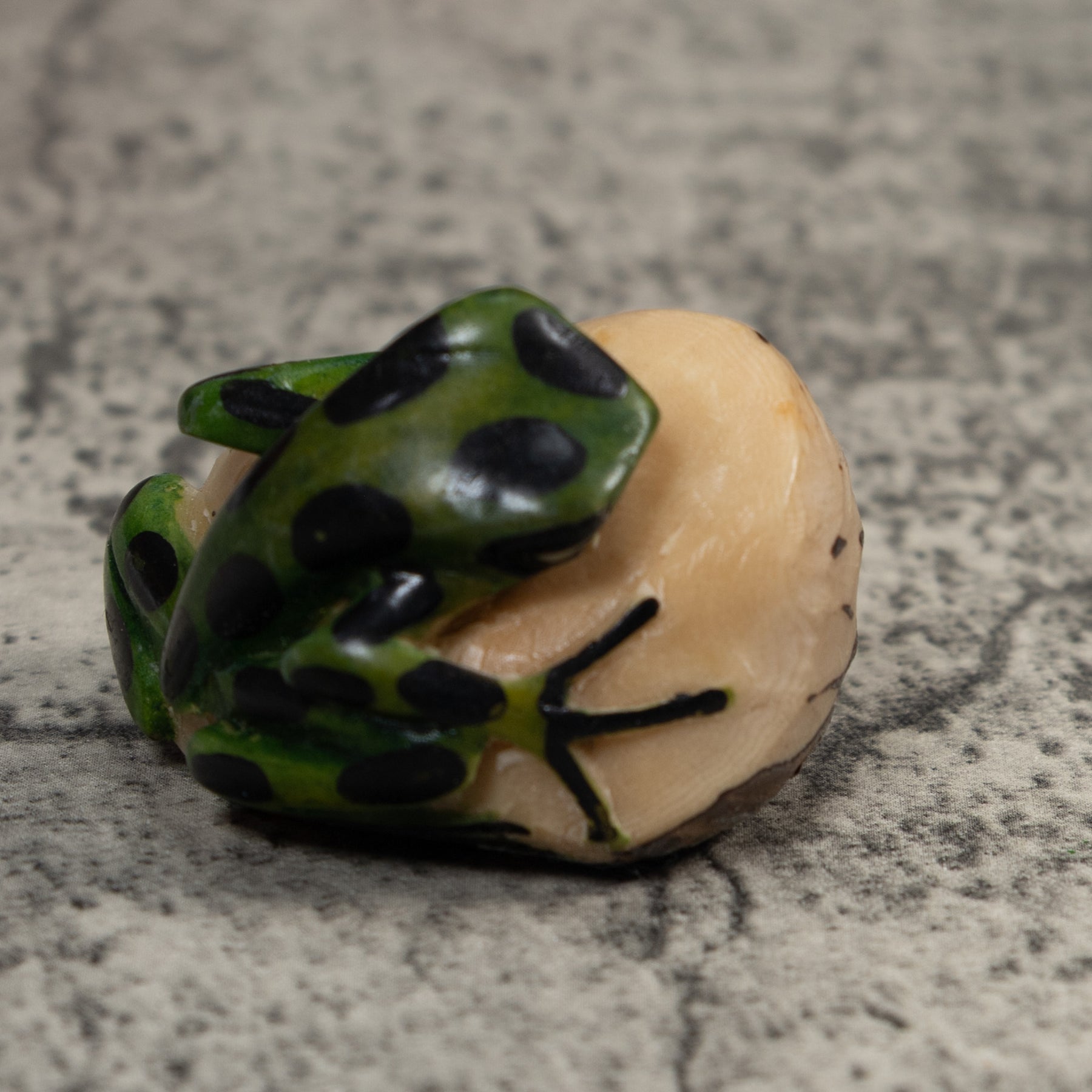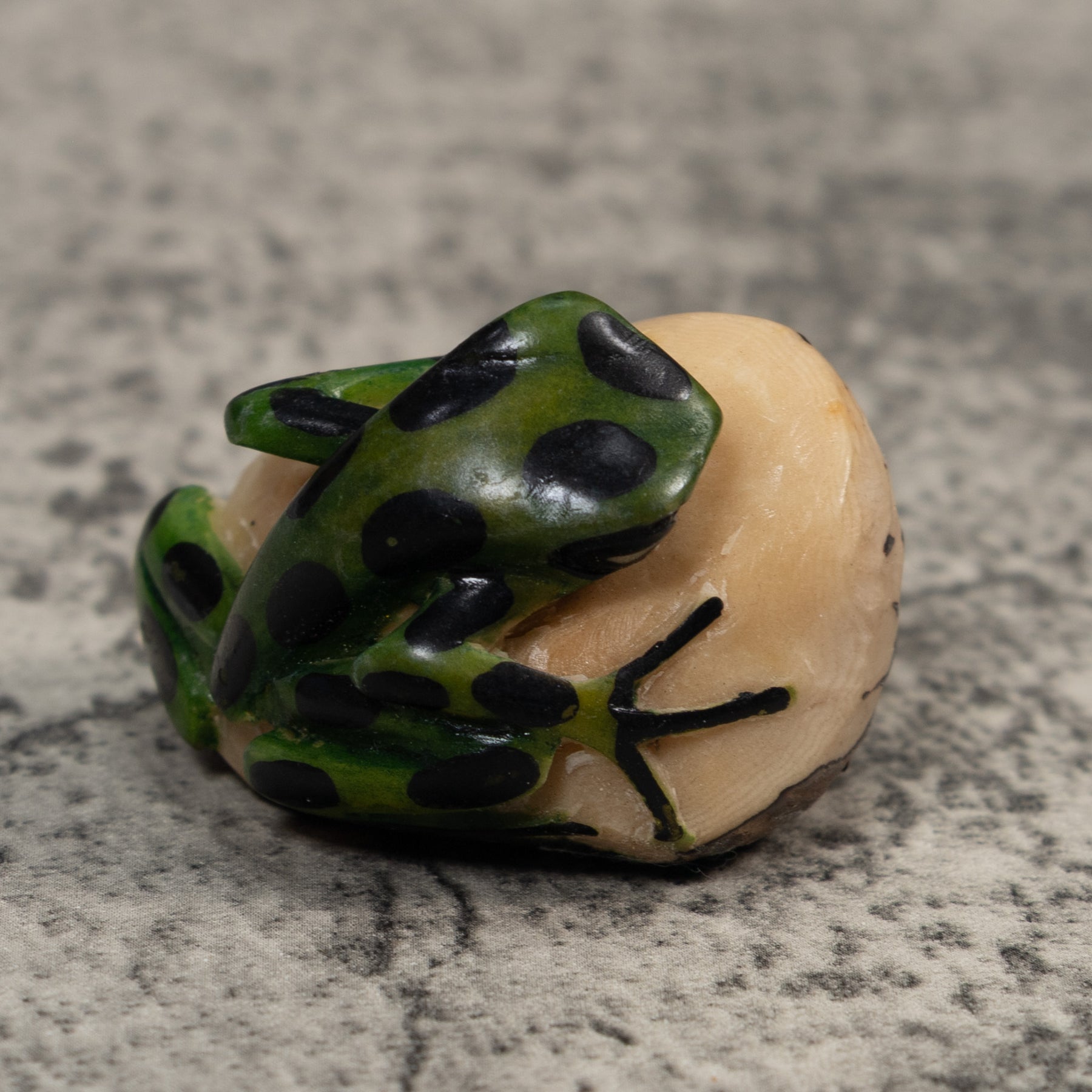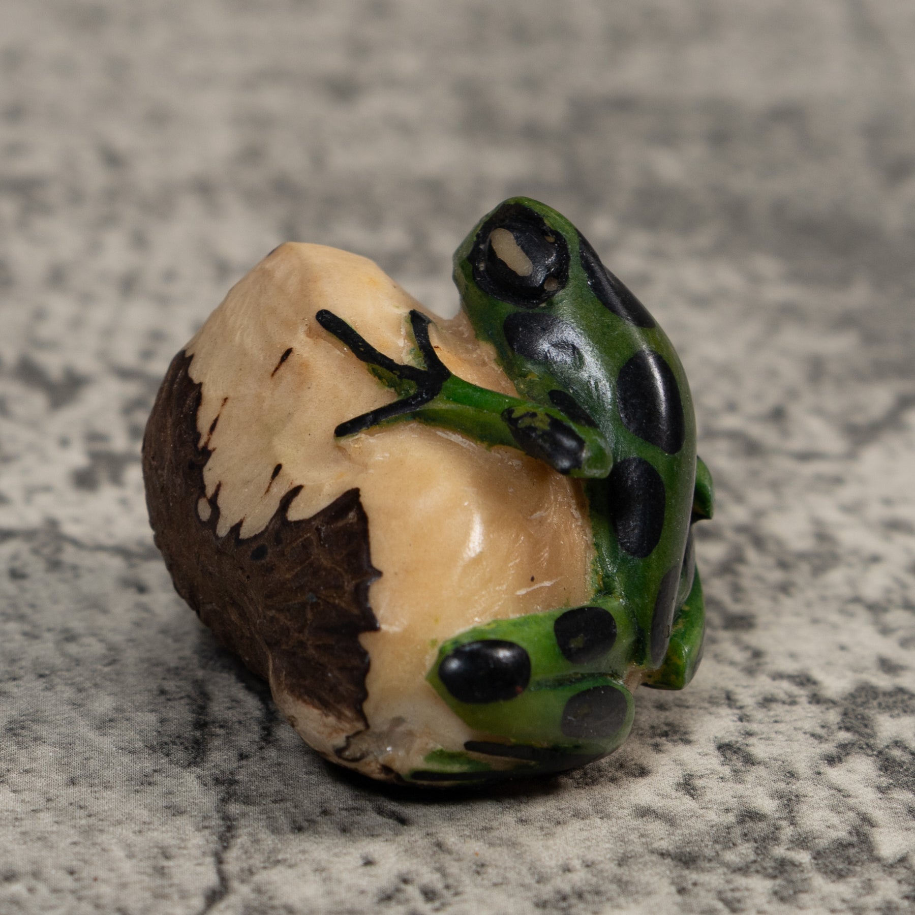 Hand carved from sustainably harvested tagua nut, often called “vegetable ivory”, this charming Frog celebrates the rich biodiversity of the Latin American rainforest. Each small sculpture is created by skilled artisans in Panama who carefully shape and polish the natural nut before bringing the animal to life with detailed hand painting. Every piece is made by our artisan partners for TraderBrock, helping support traditional craft and fair, long term relationships with local makers.