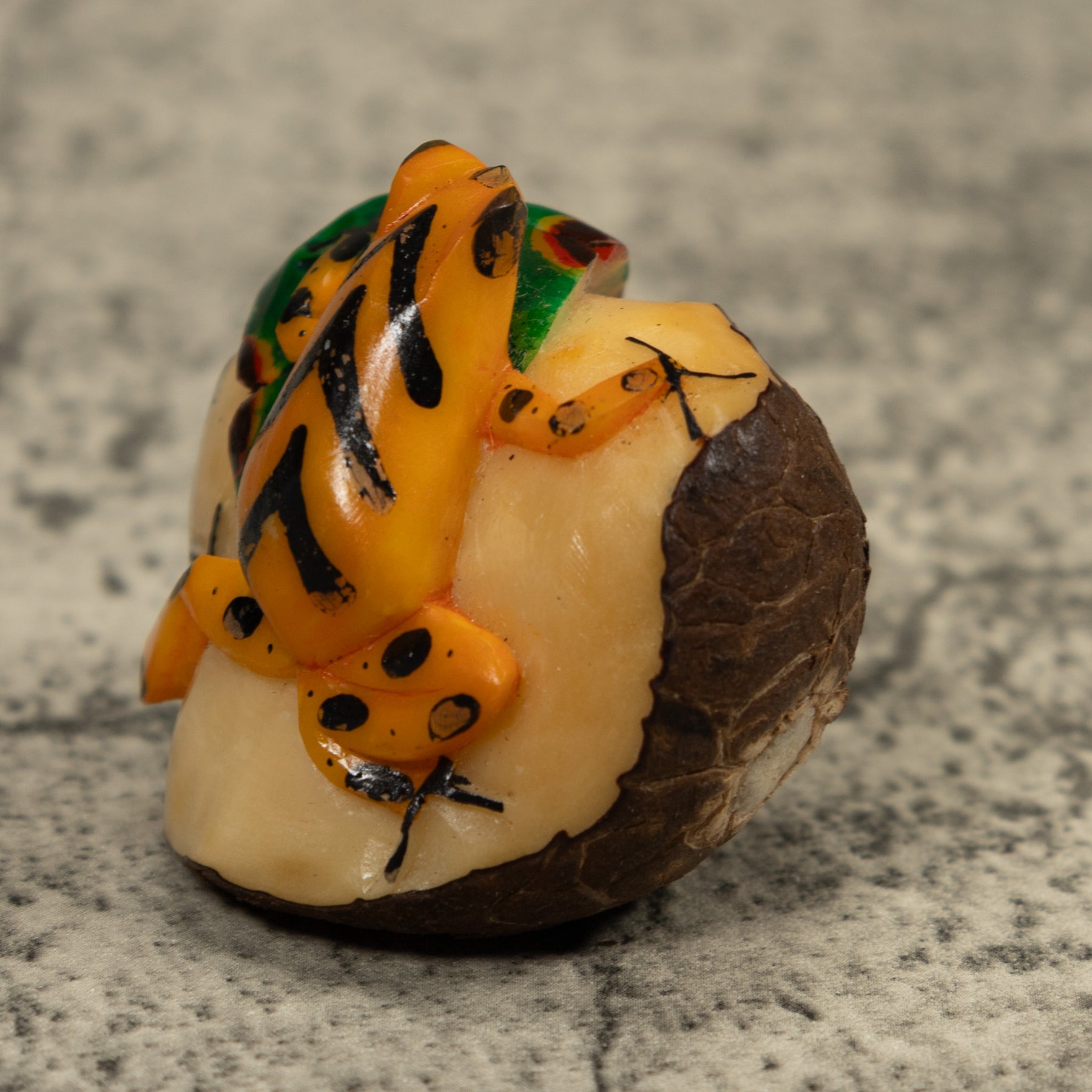 Hand carved from sustainably harvested tagua nut, often called “vegetable ivory”, this charming Gold And Black Frog celebrates the rich biodiversity of the Latin American rainforest. Each small sculpture is created by skilled artisans in Panama who carefully shape and polish the natural nut before bringing the animal to life with detailed hand painting. Every piece is made by our artisan partners for TraderBrock, helping support traditional craft and fair, long term relationships with local makers.