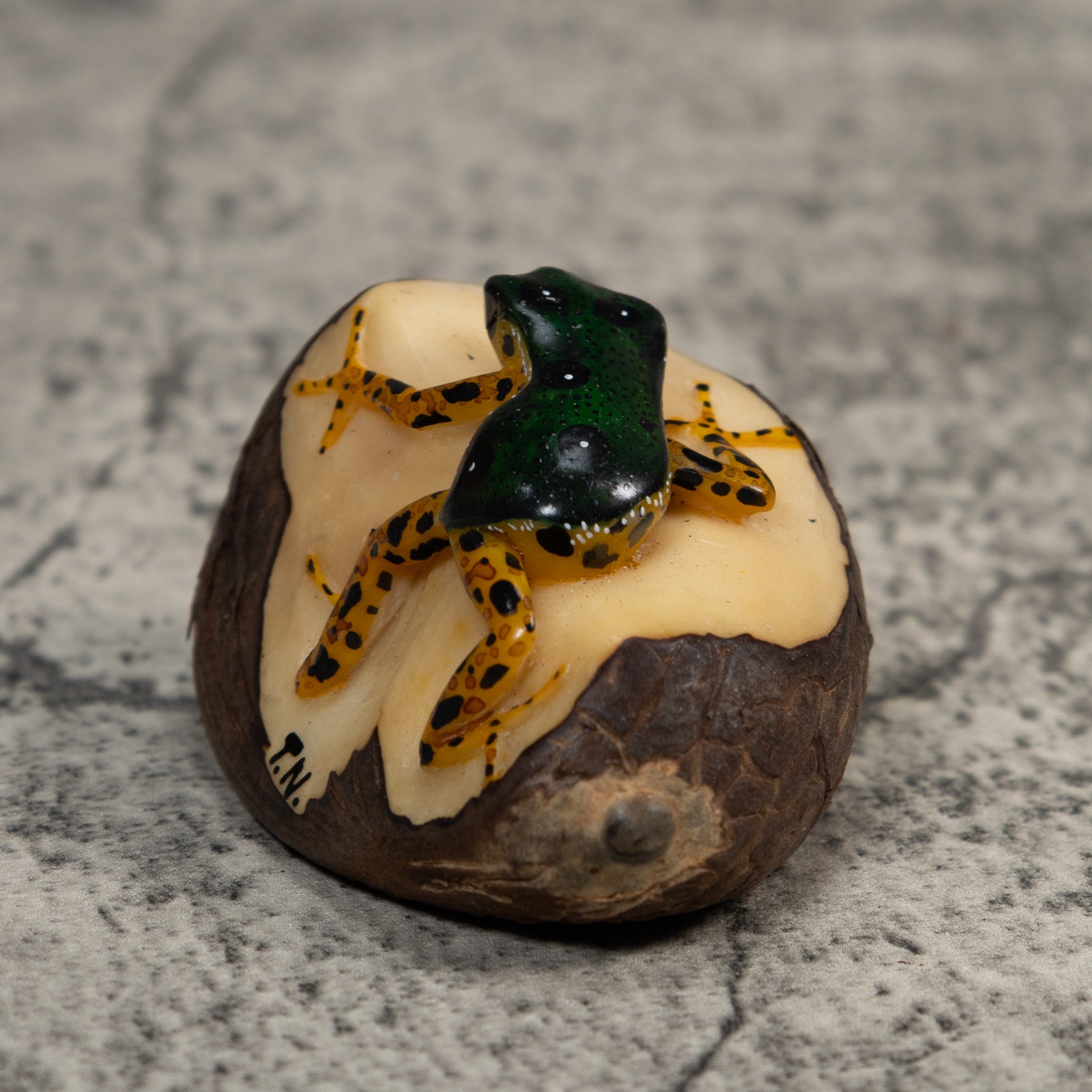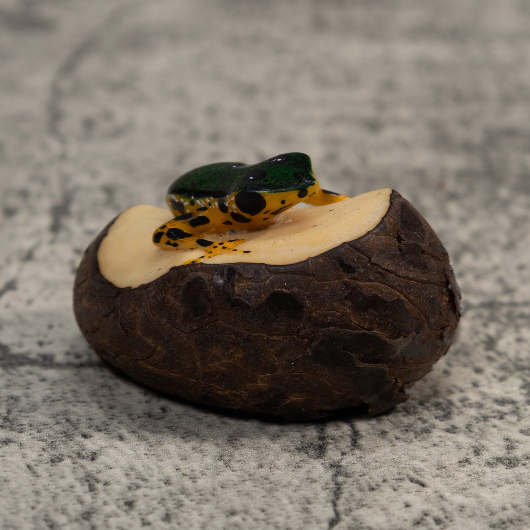Hand carved from sustainably harvested tagua nut, often called “vegetable ivory”, this charming Frog celebrates the rich biodiversity of the Latin American rainforest. Each small sculpture is created by skilled artisans in Panama who carefully shape and polish the natural nut before bringing the animal to life with detailed hand painting. Every piece is made by our artisan partners for TraderBrock, helping support traditional craft and fair, long term relationships with local makers.