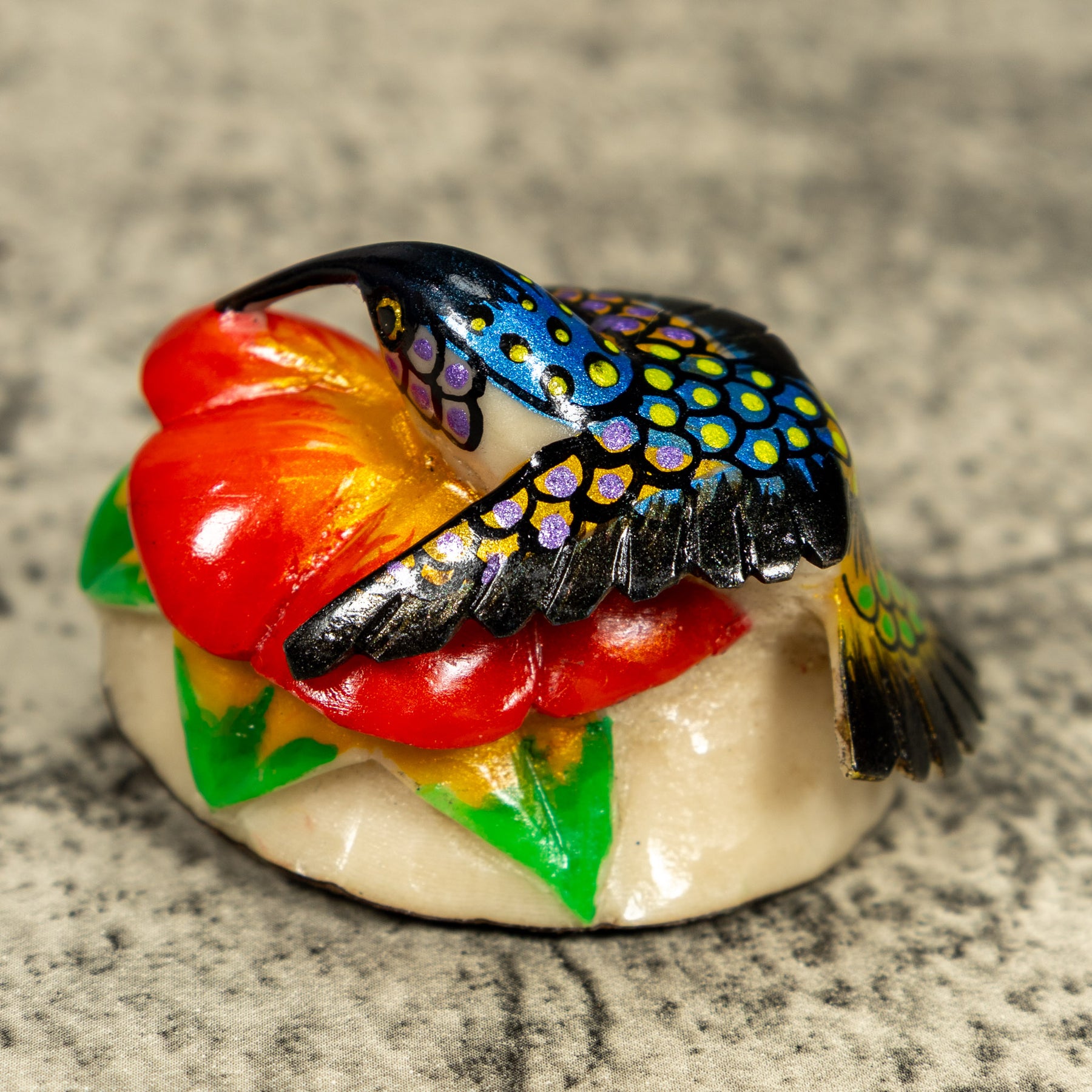 Hand carved from sustainably harvested tagua nut, often called “vegetable ivory”, this charming Hummingbird celebrates the rich biodiversity of the Latin American rainforest. Each small sculpture is created by skilled artisans in Panama who carefully shape and polish the natural nut before bringing the animal to life with detailed hand painting. Every piece is made by our artisan partners for TraderBrock, helping support traditional craft and fair, long term relationships with local makers.