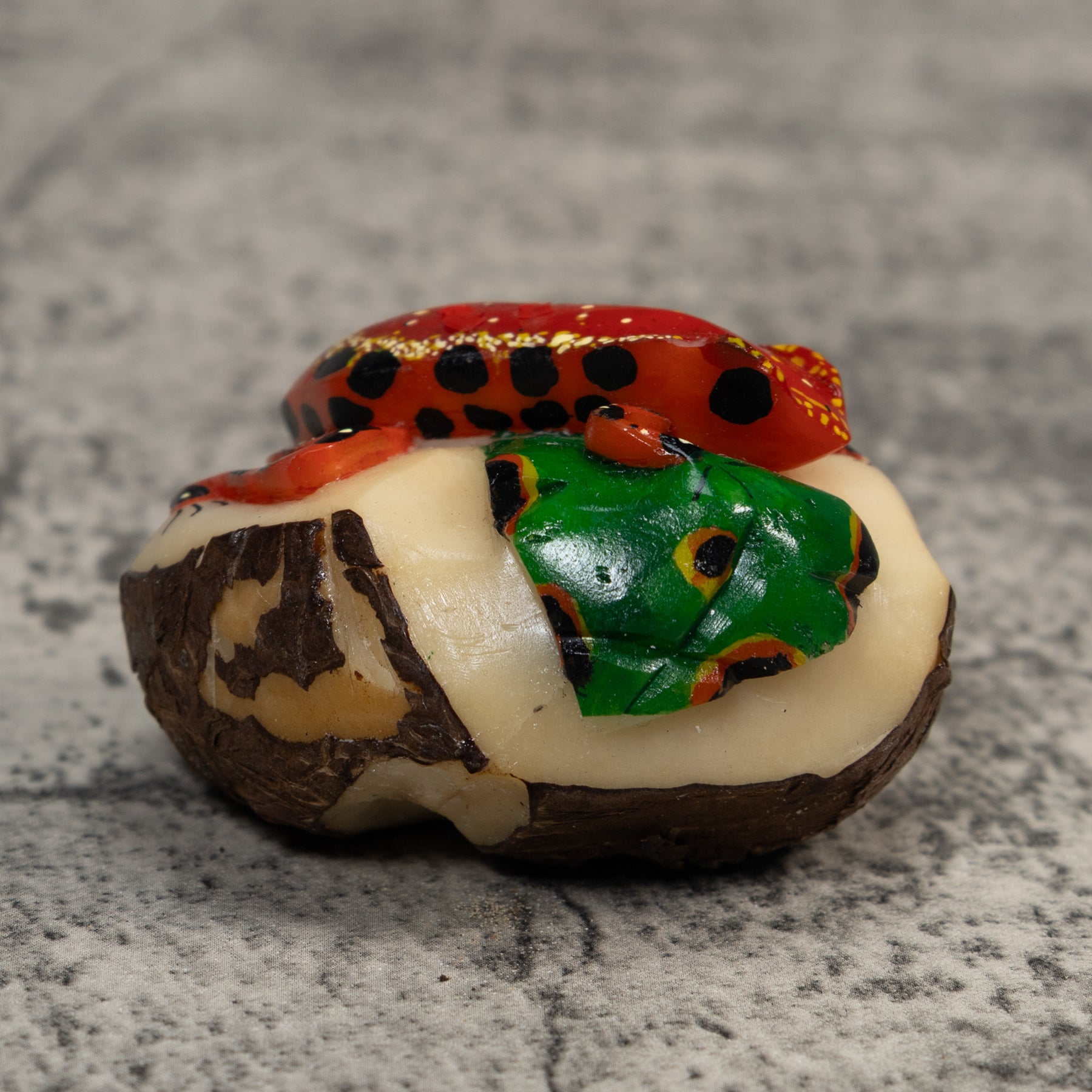 Hand carved from sustainably harvested tagua nut, often called “vegetable ivory”, this charming Frog celebrates the rich biodiversity of the Latin American rainforest. Each small sculpture is created by skilled artisans in Panama who carefully shape and polish the natural nut before bringing the animal to life with detailed hand painting. Every piece is made by our artisan partners for TraderBrock, helping support traditional craft and fair, long term relationships with local makers.