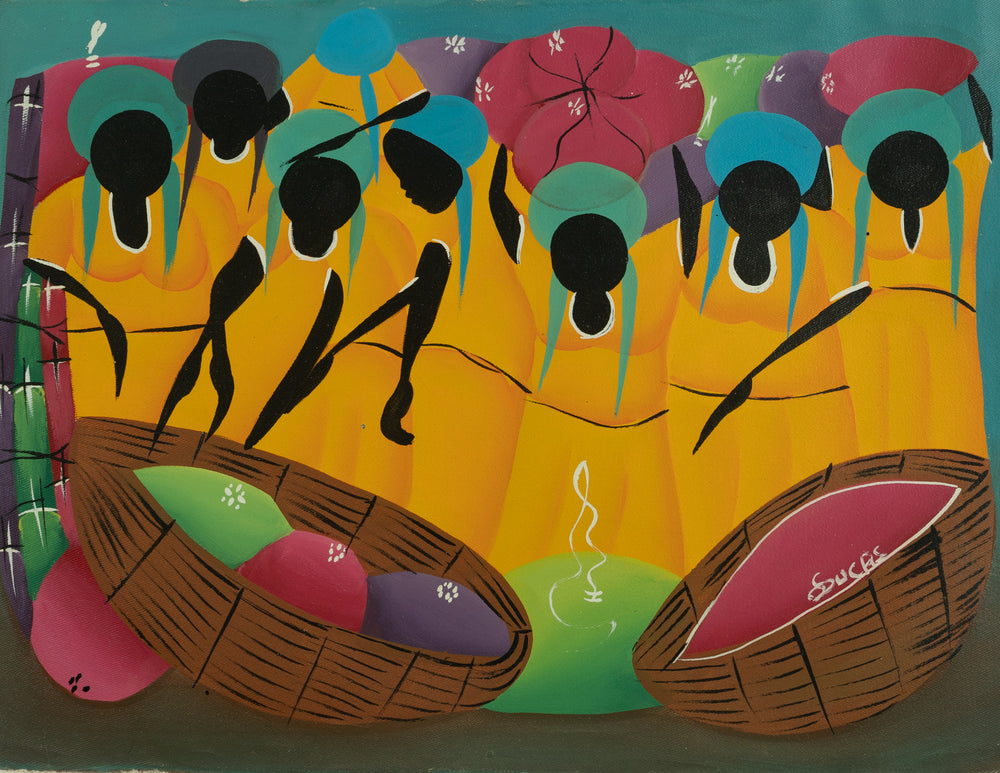 "Market Day Melody" offers a glimpse into the heart of Haitian culture, perfect for anyone who appreciates the rhythm of daily commerce and the beauty of community gatherings. It's a striking piece that adds a touch of Haitian spirit and conviviality to any room.