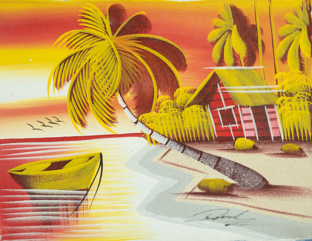 SEO Keywords: Haitian seascape painting, sunset beach artwork, original Haitian art, thatched hut canvas, tropical sunset painting, serene seascape art.