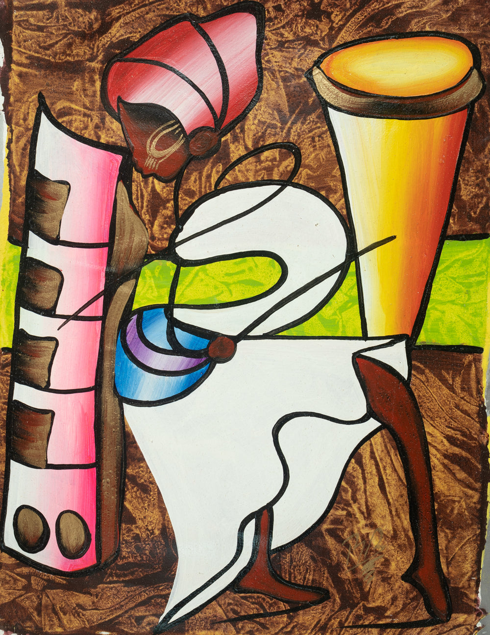 The bold use of color brings each instrument to life, from the warm tones of the drum to the cool hues of the wind instruments, against a textured brown background reminiscent of Haiti's earthy terrain. The painting's abstract nature invites the viewer to feel the rhythm and melodies that are an integral part of Haitian culture.