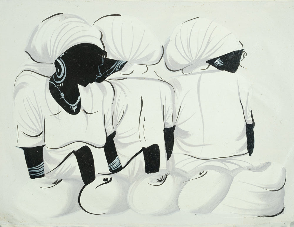 "Silent Dialogue" is a striking monochromatic painting that portrays the silent communication and shared experiences of Haitian women. This piece features three women in profile, their white clothing and headscarves rendered in stark contrast to the dark background, creating a bold visual impact.