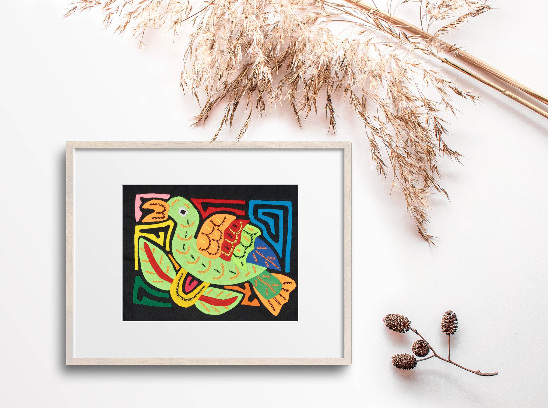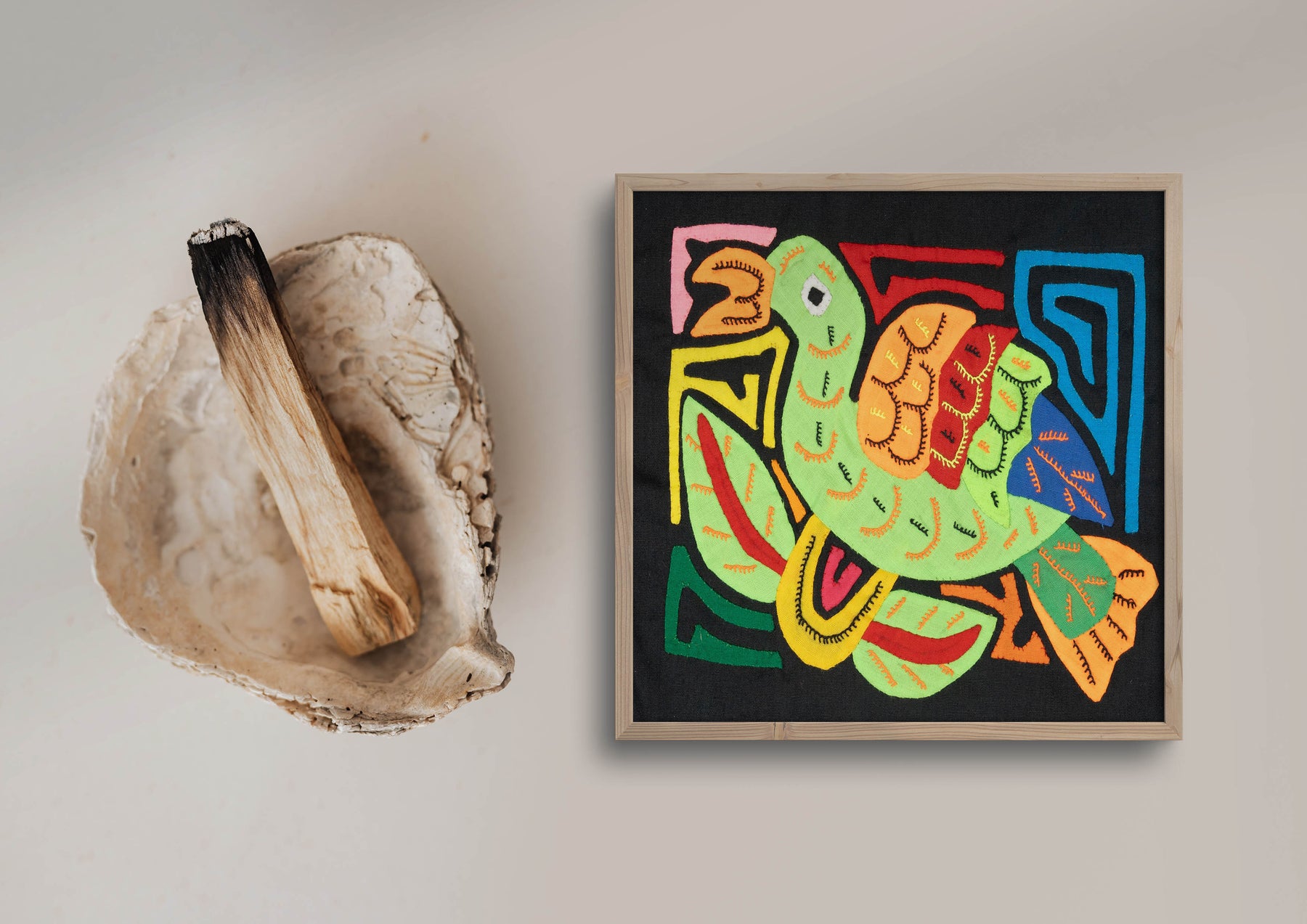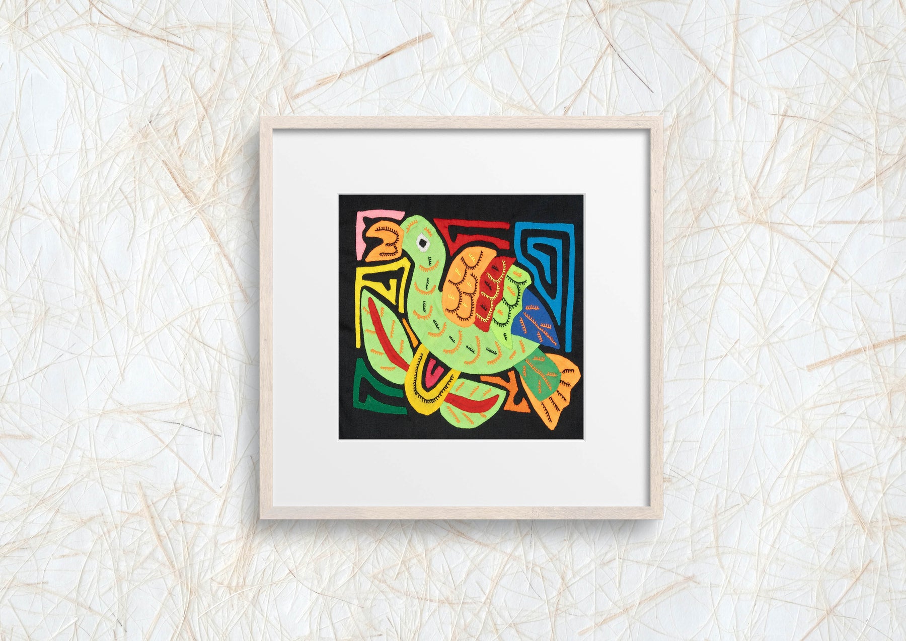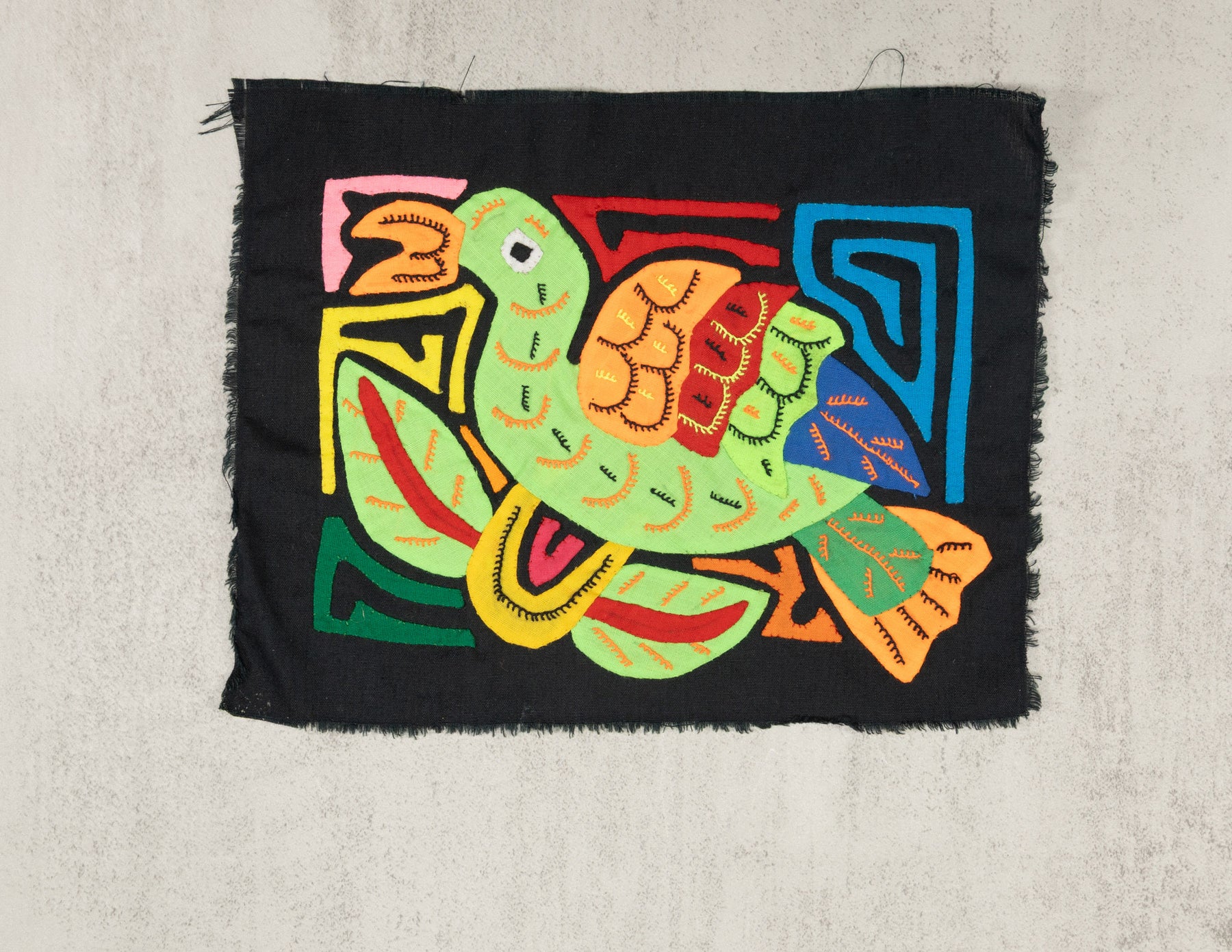 Hand sewn from layered cotton fabric, this colorful Multicolor Green And Orange Bird Molita celebrates the traditional textile art of the Guna people of Panama. Each small panel is created using reverse appliqué, where artisans carefully cut and stitch several layers of cloth to reveal intricate patterns, animals, and geometric motifs. Every molita is made by our artisan partners for TraderBrock, supporting long term relationships with Guna communities in the Guna Yala region.