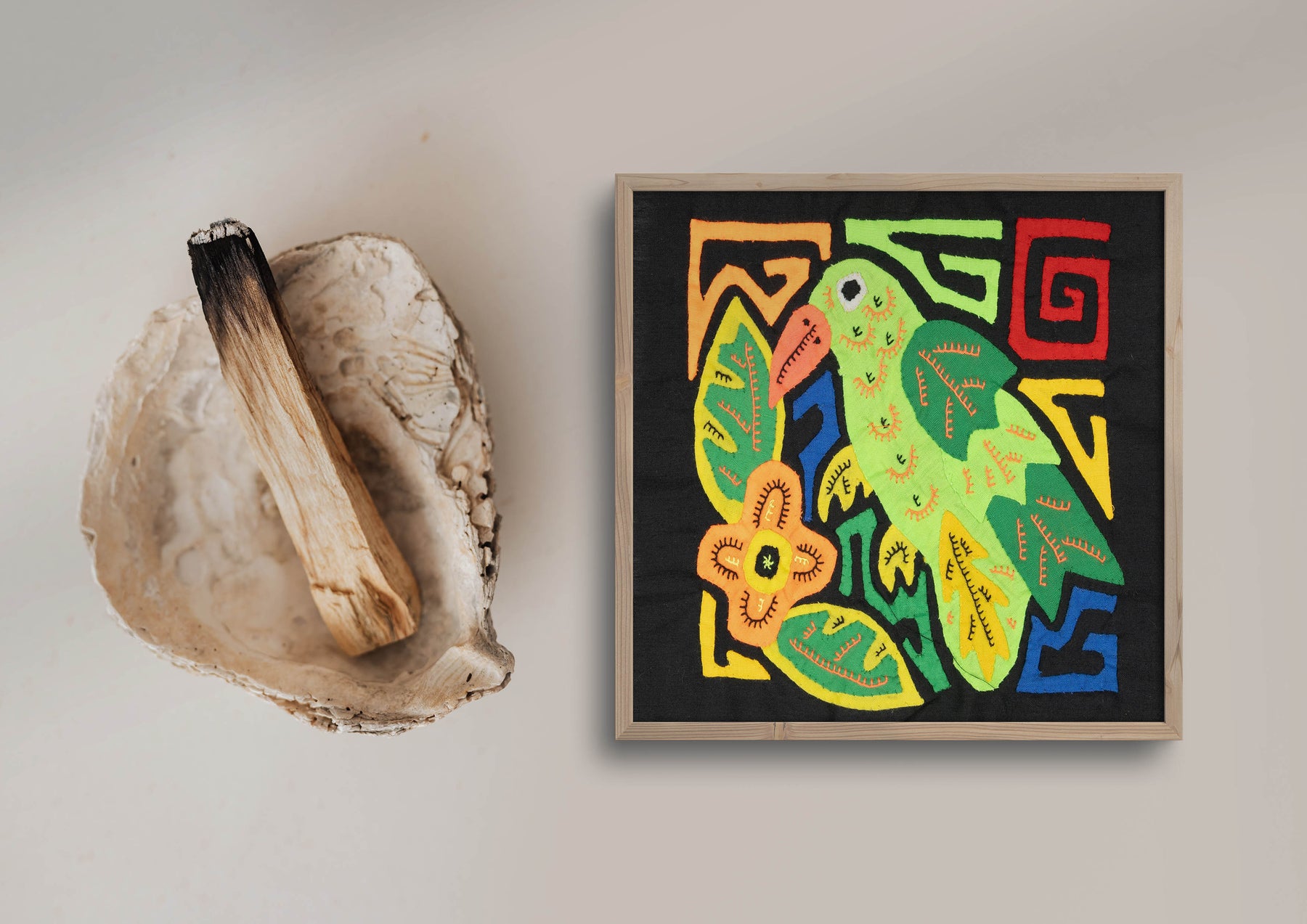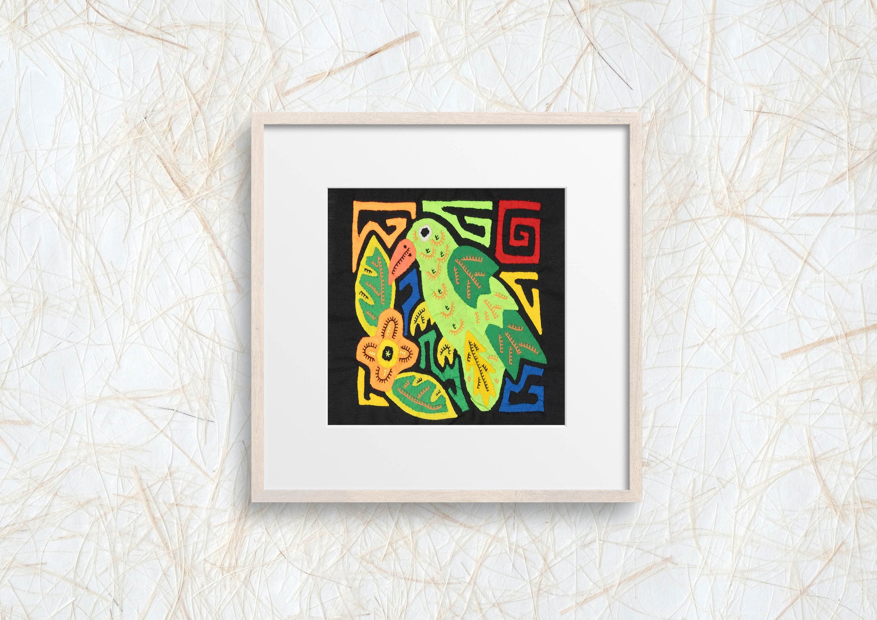Hand sewn from layered cotton fabric, this colorful Multicolor Green And Orange Bird Molita celebrates the traditional textile art of the Guna people of Panama. Each small panel is created using reverse appliqué, where artisans carefully cut and stitch several layers of cloth to reveal intricate patterns, animals, and geometric motifs. Every molita is made by our artisan partners for TraderBrock, supporting long term relationships with Guna communities in the Guna Yala region.