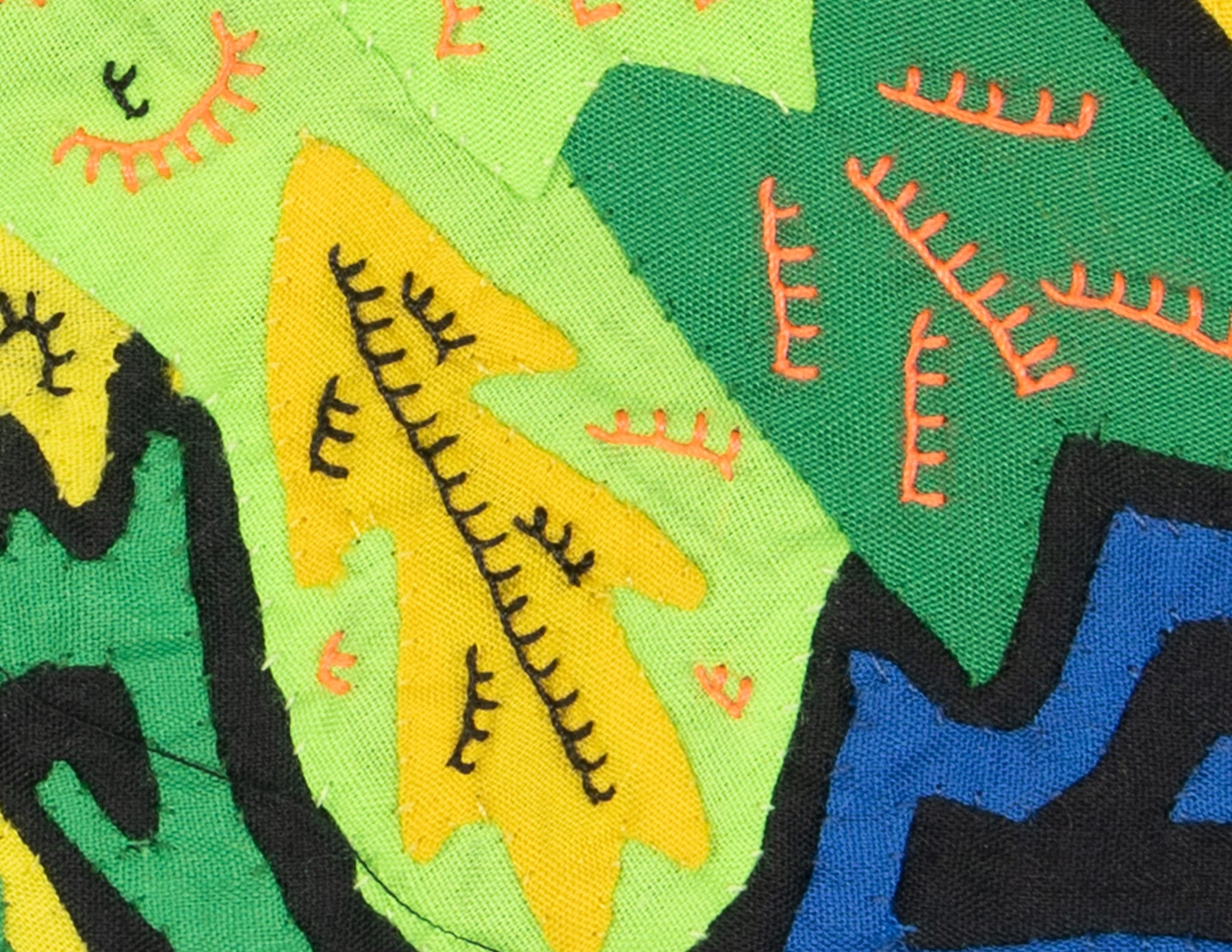 Scenic molas depict landscapes such as islands, rivers, or village life. These compositions capture the daily environment of the Guna people and celebrate their deep bond with the land and sea.