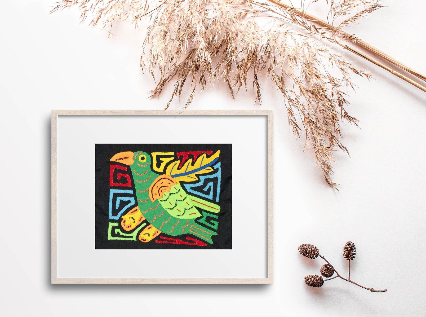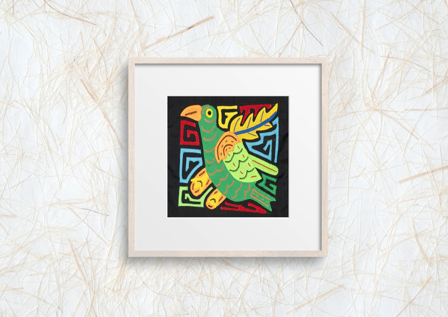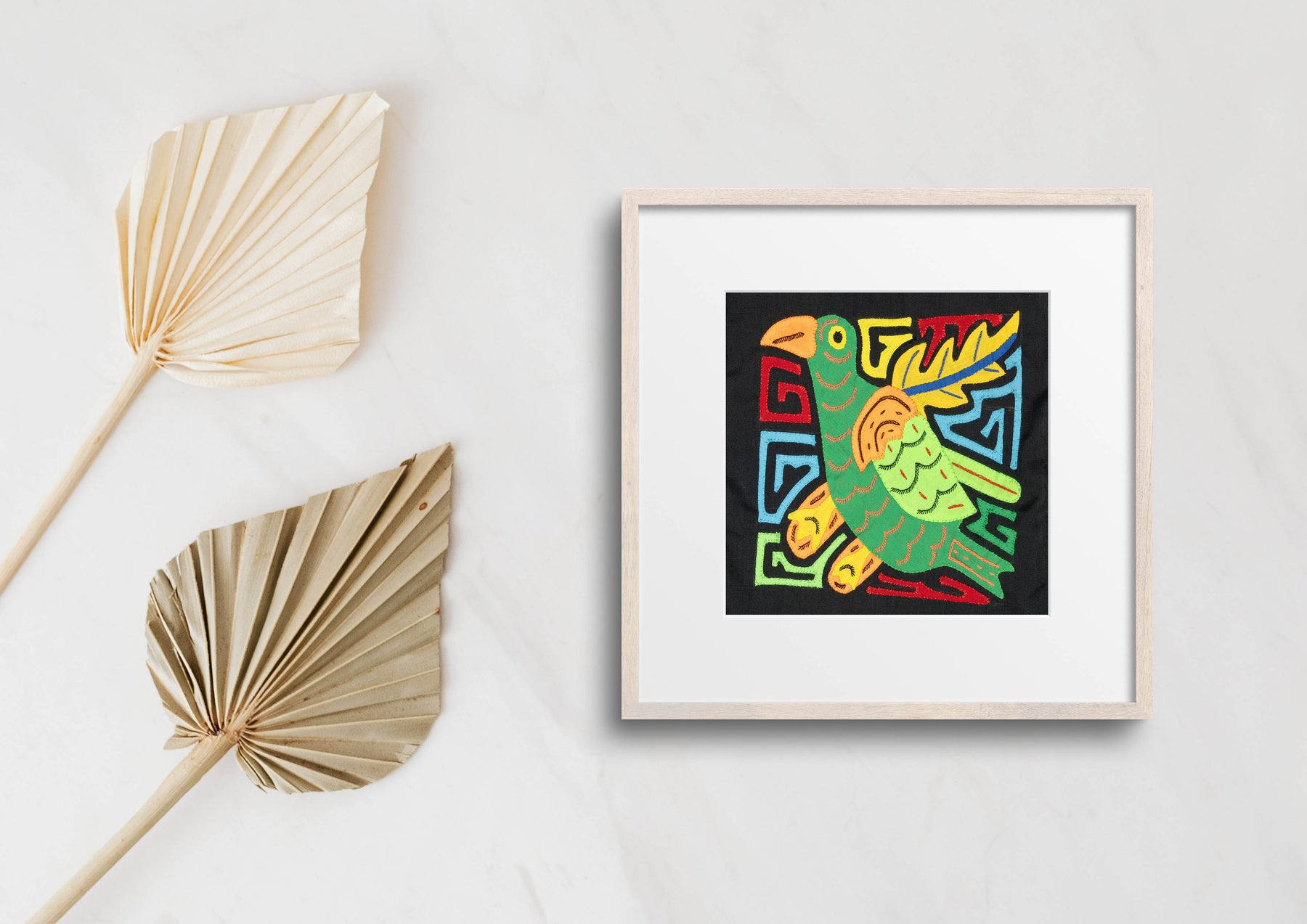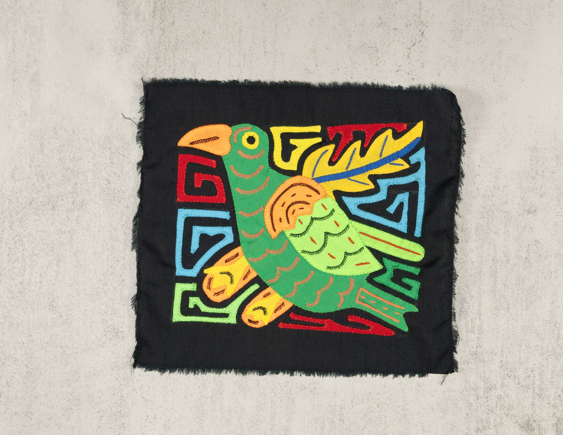 Hand sewn from layered cotton fabric, this colorful Multicolor Green And Orange Bird Molita celebrates the traditional textile art of the Guna people of Panama. Each small panel is created using reverse appliqué, where artisans carefully cut and stitch several layers of cloth to reveal intricate patterns, animals, and geometric motifs. Every molita is made by our artisan partners for TraderBrock, supporting long term relationships with Guna communities in the Guna Yala region.